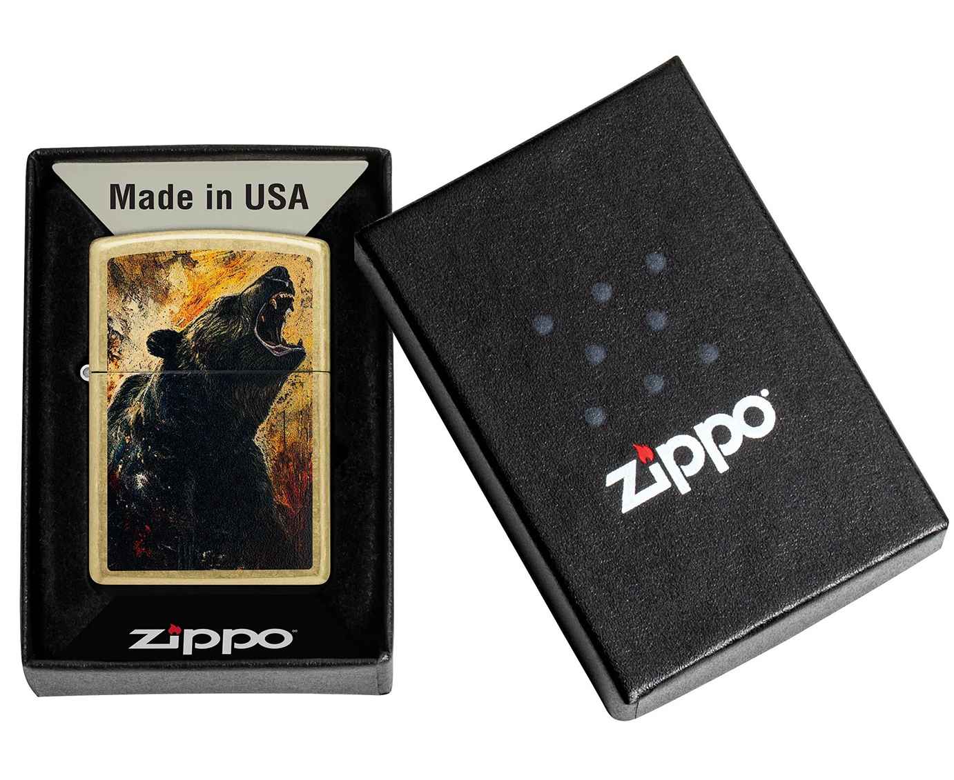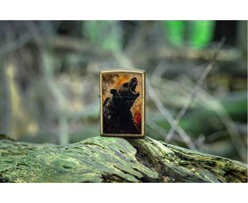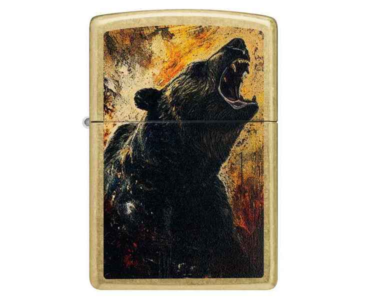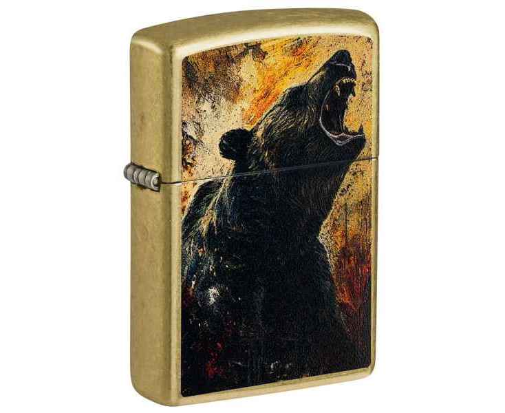 Могучий медведь гризли рычит с поверхности этой классической зажигалки Street Brass – вся сцена вдохновлена акварельными пейзажами дикой природы.