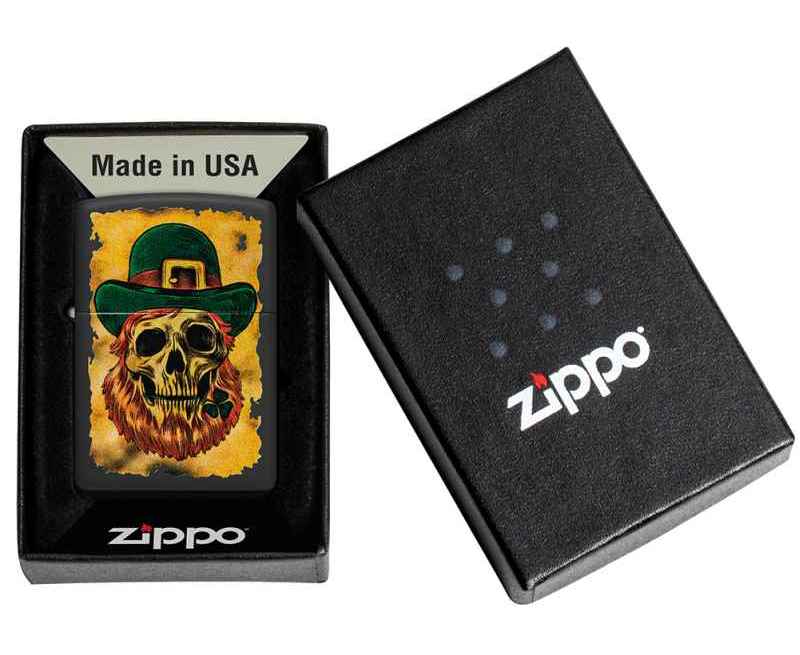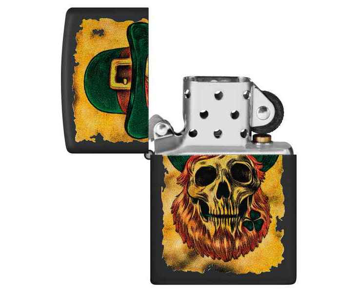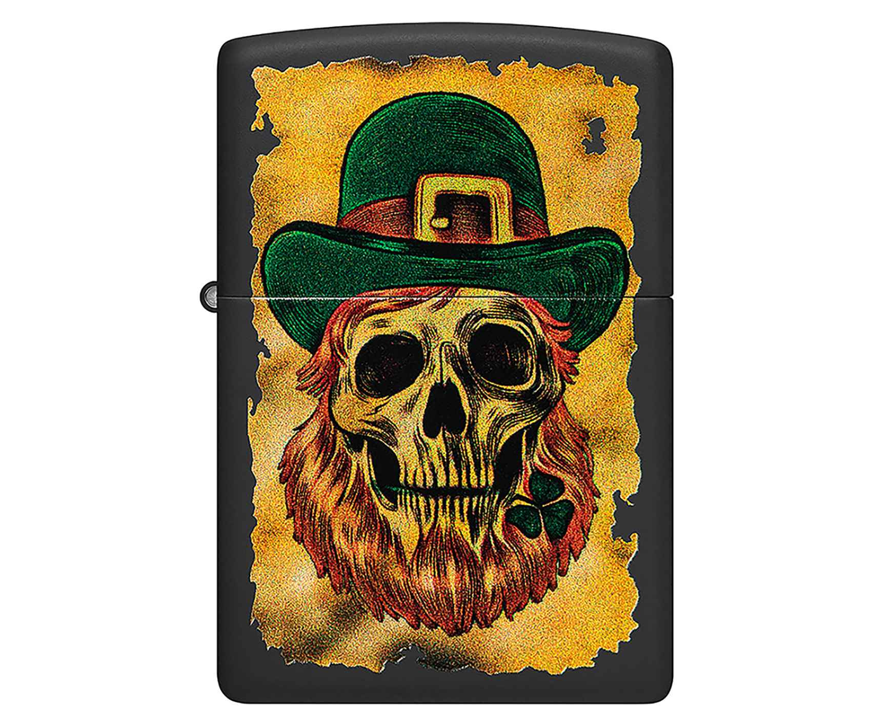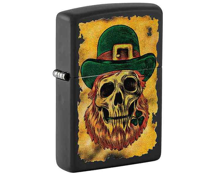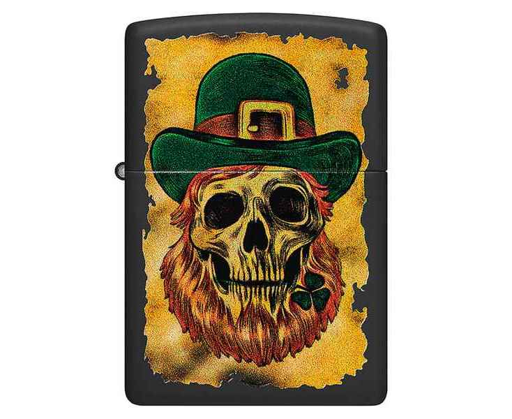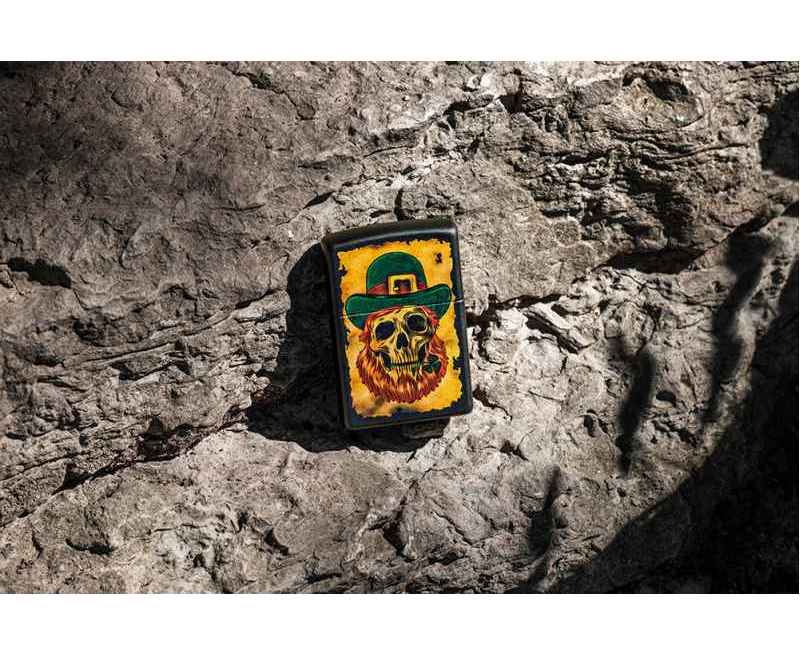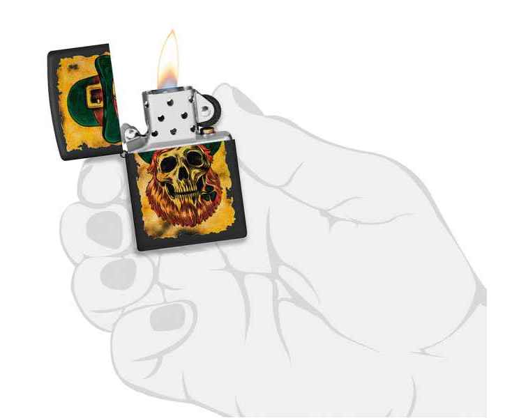 Усталый лепрекон в традиционной шляпе-котелке на фоне обугленной карты сокровищ – вот такое веселое цветной изображение развернули на поверхности этой классической зажигалки Black Matte.