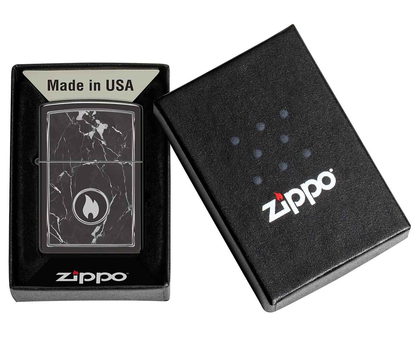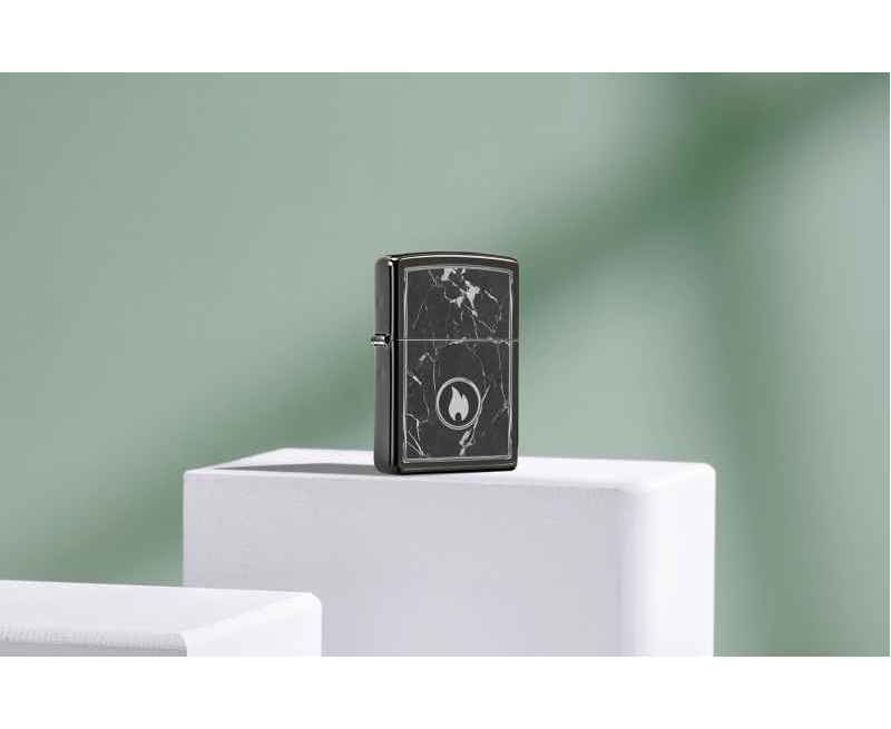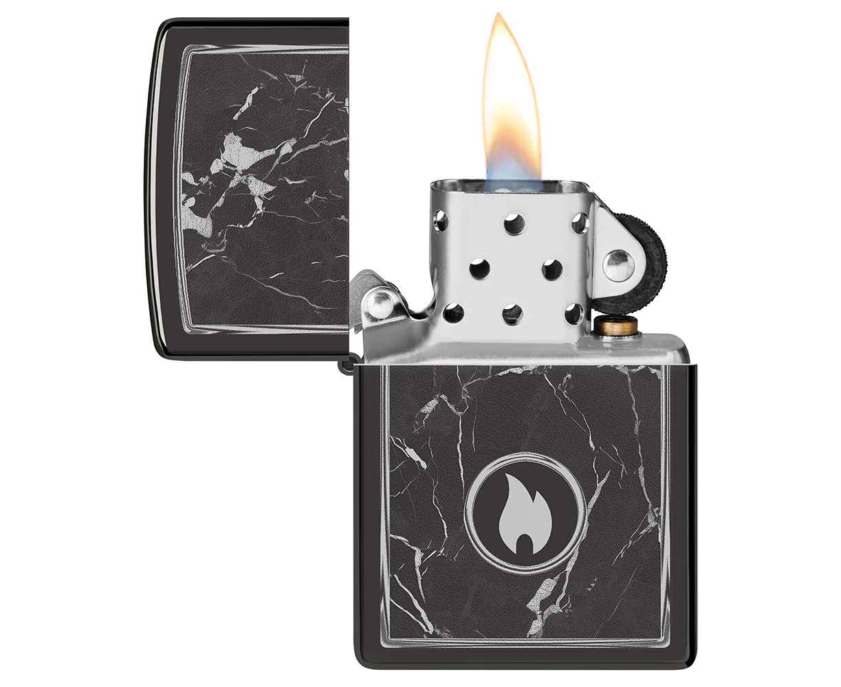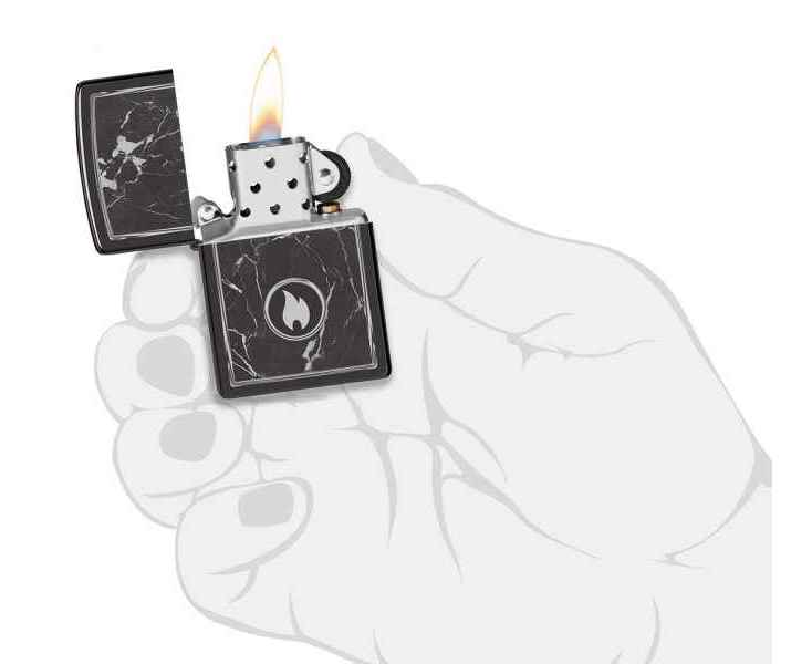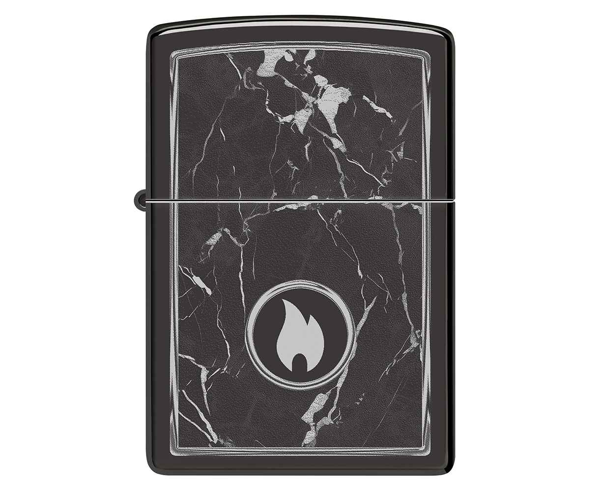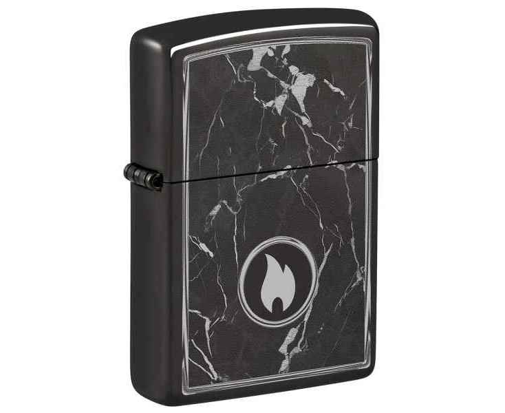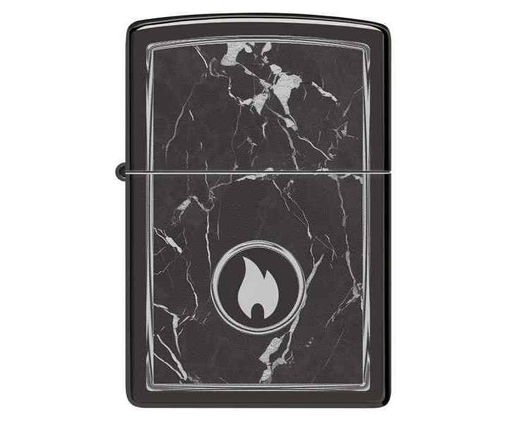 На поверхности этой классической зажигалки черного изображен завораживающий рисунок пламени Zippo, окруженный реалистично выглядящими мраморными прожилками.