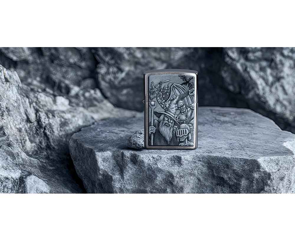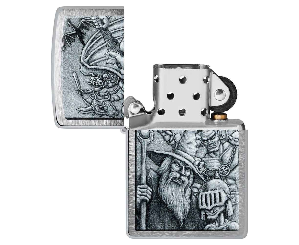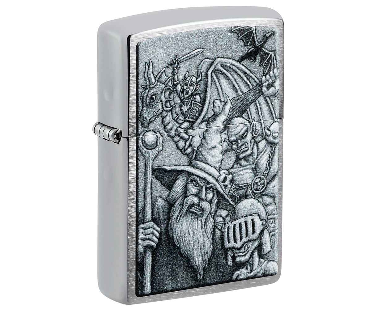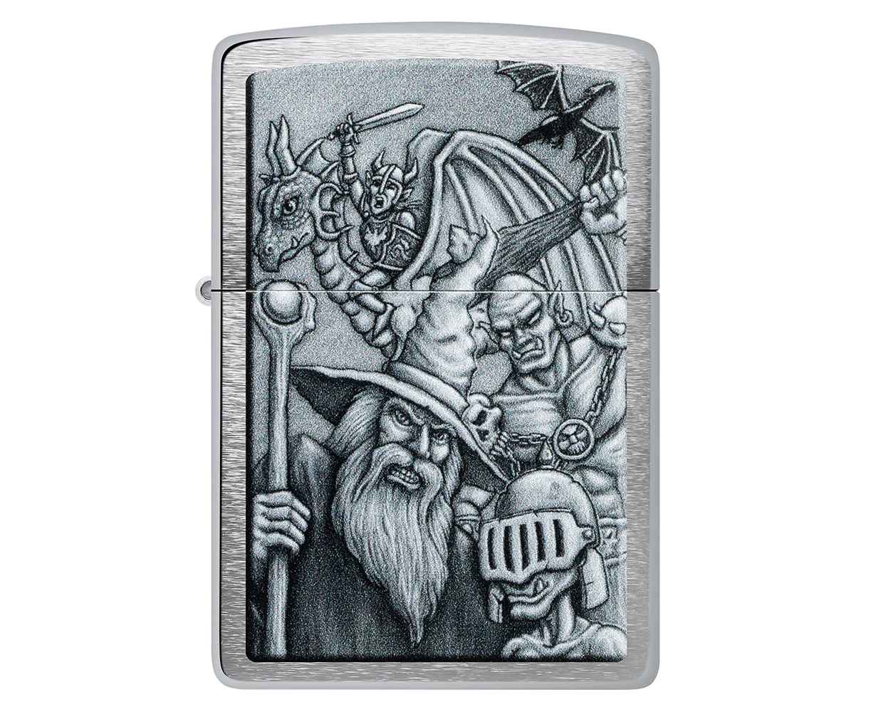 Окунитесь в другой мир с этой классической зажигалкой Brushed Chrome. Дизайн имитирует мифологическую сцену с гоблинами, волшебниками, драконами и многими другими фантастическими персонажами.