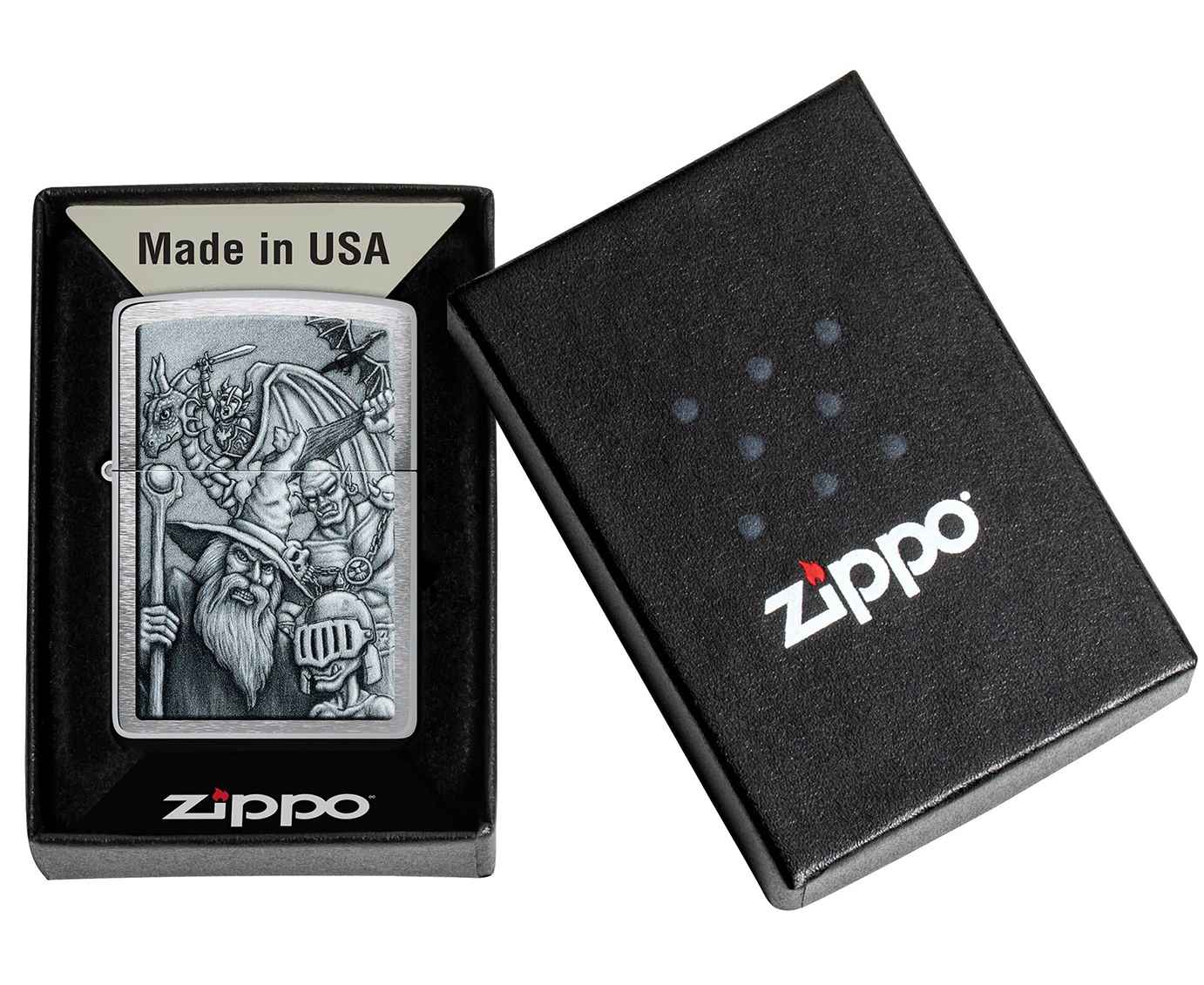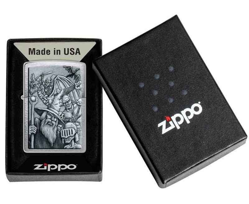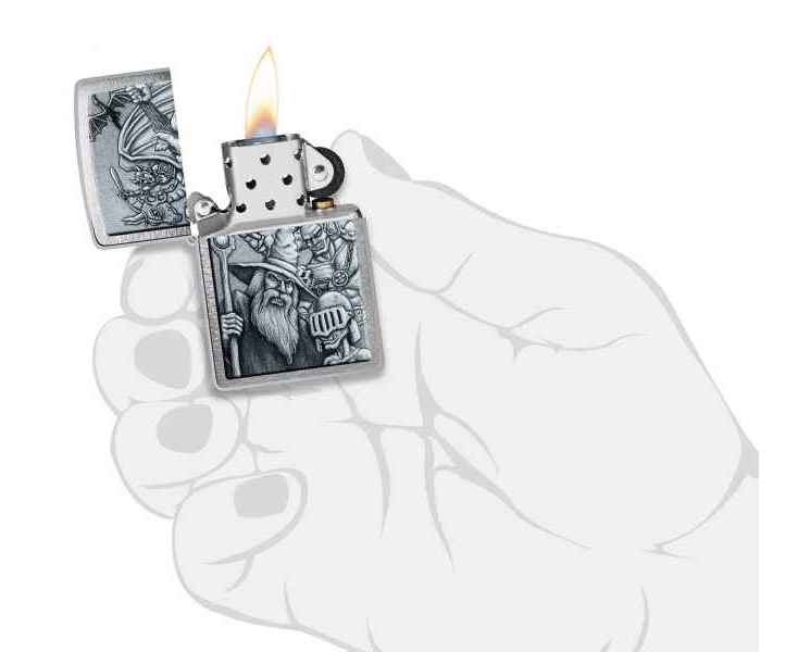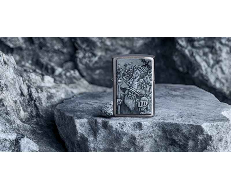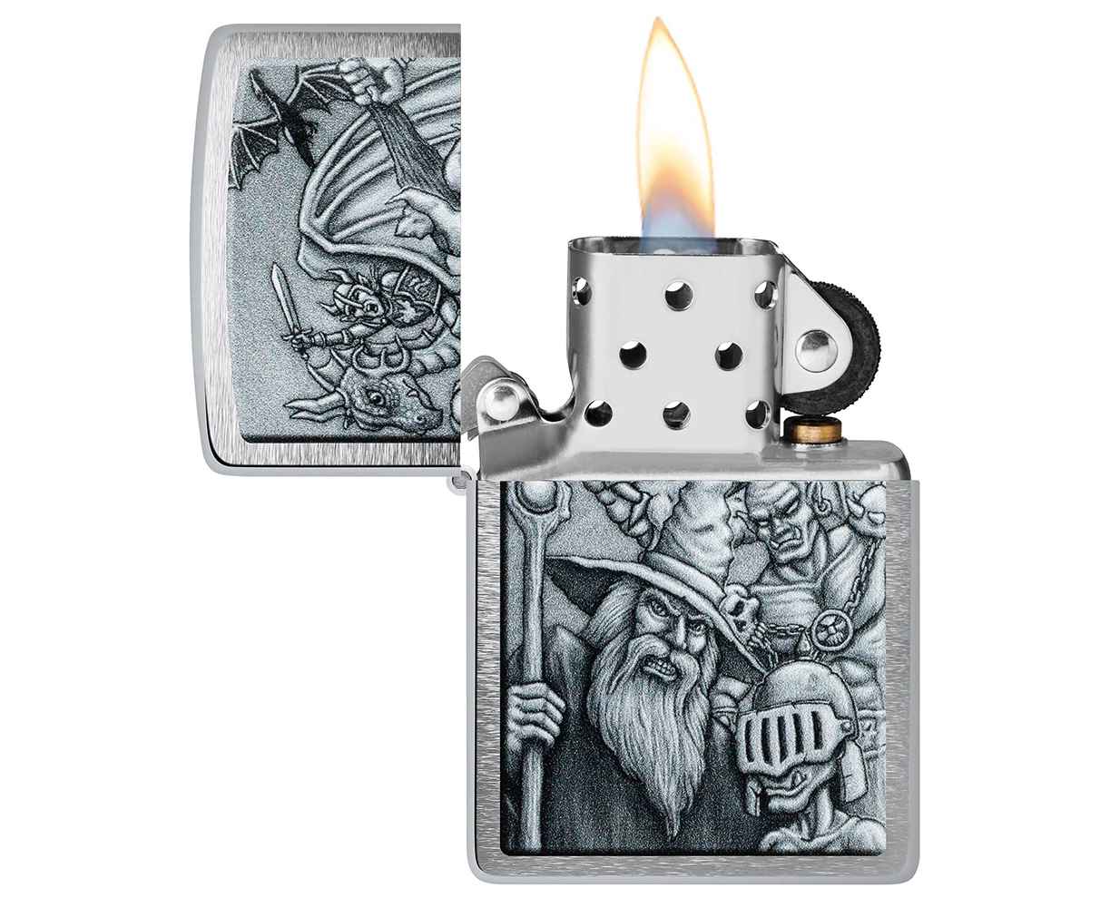 Окунитесь в другой мир с этой классической зажигалкой Brushed Chrome. Дизайн имитирует мифологическую сцену с гоблинами, волшебниками, драконами и многими другими фантастическими персонажами.