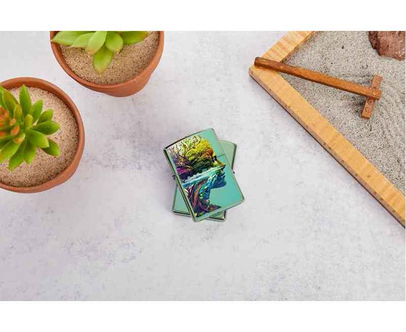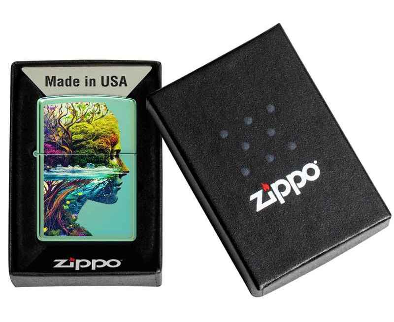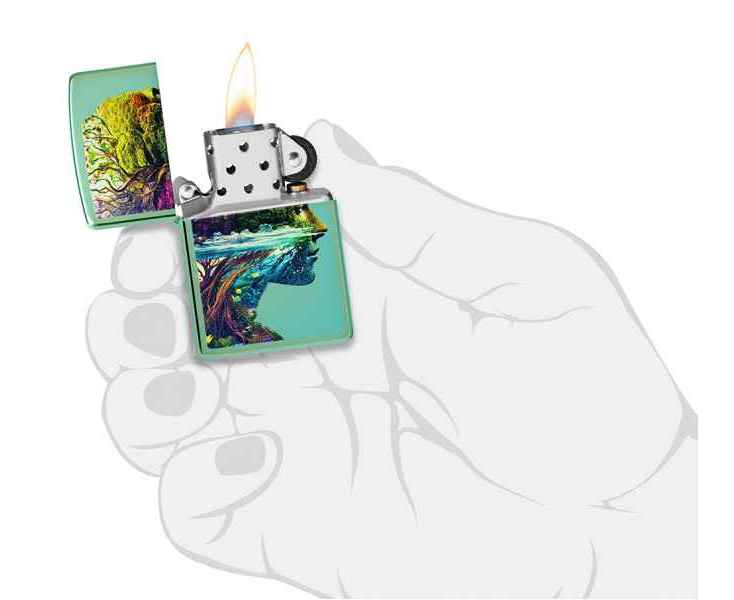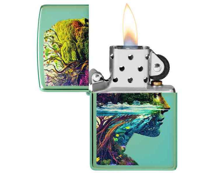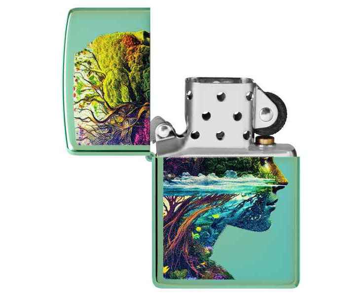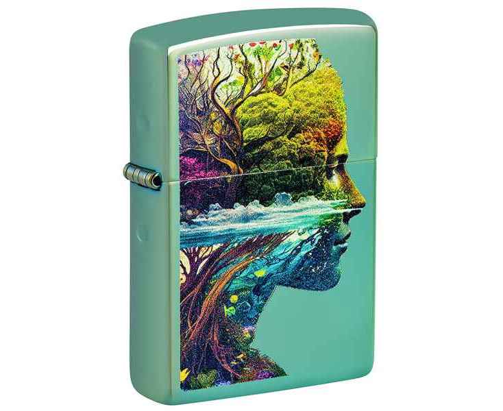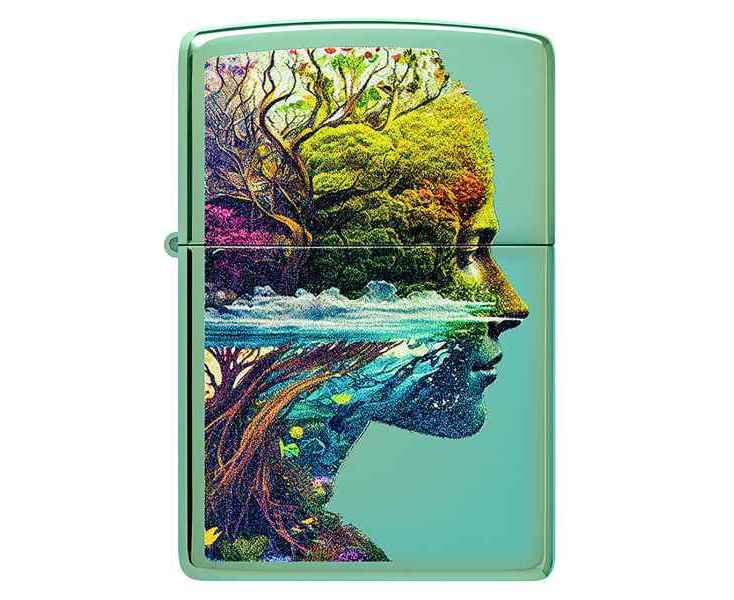На этой классической зажигалке High Polish Green с успокаивающим цветным дизайном изображен безмятежный лесной пейзаж в человеческом обличье.