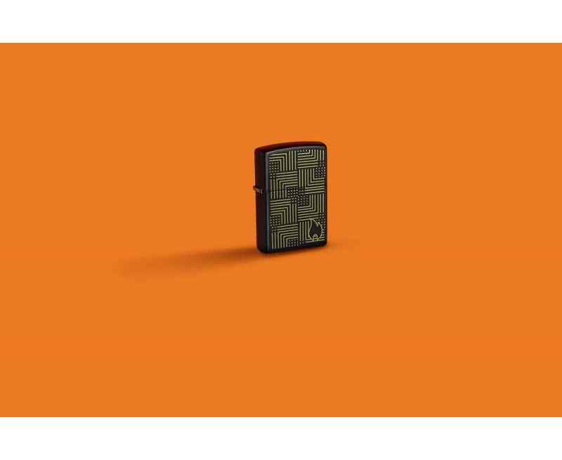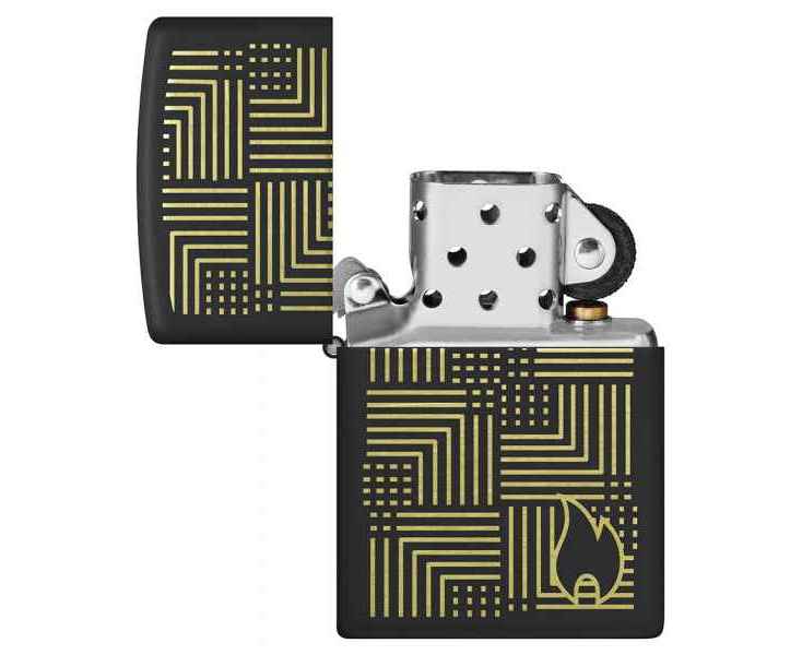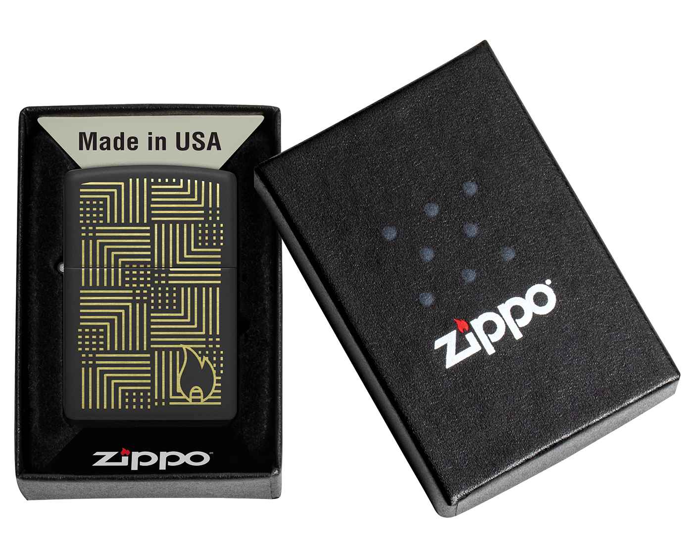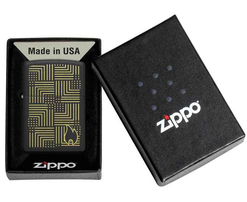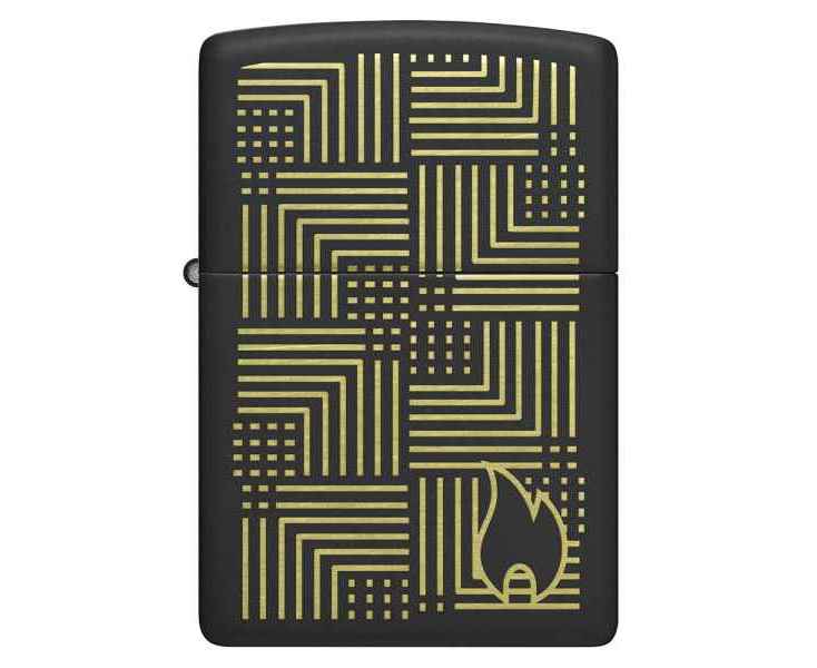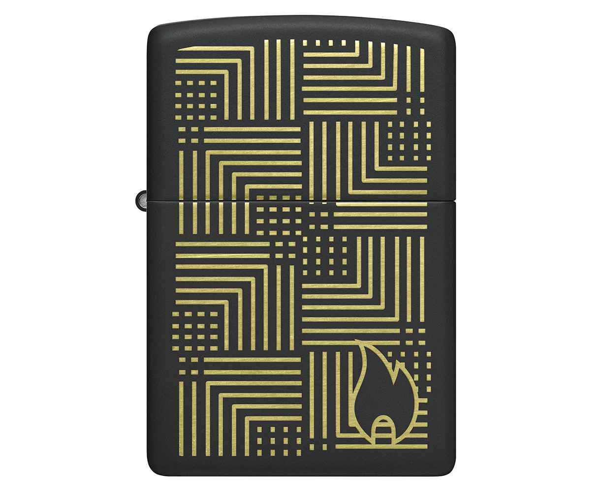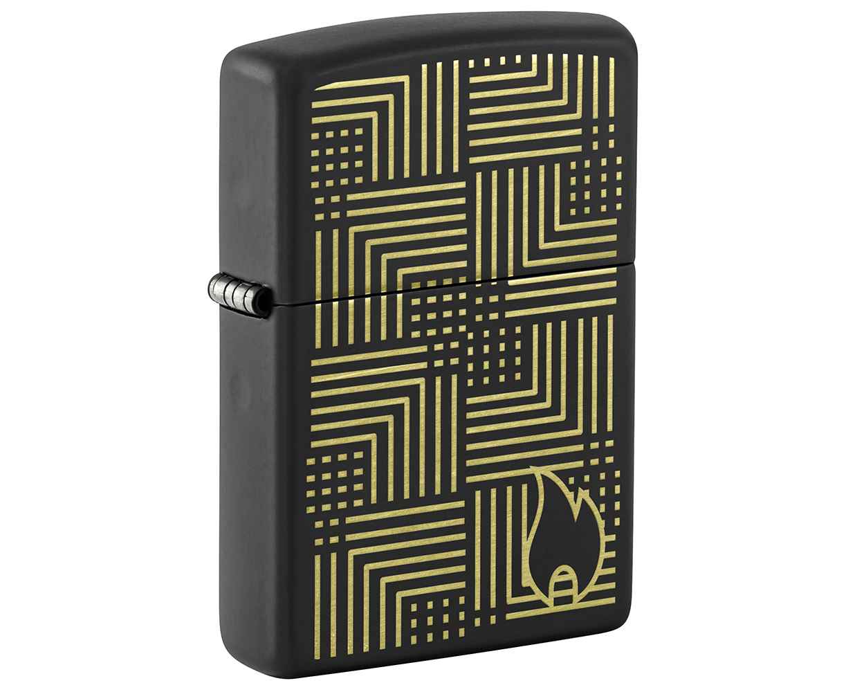 Мотив в стиле арт-деко, выполненный в роскошных латунных тонах методом лазерной гравировки, идеально симметрично смотрится на этой классической зажигалке Zippo черного матового цвета.