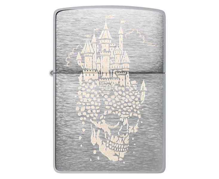 На этой классической зажигалке с матовым хромированным покрытием величественно возвышается замок. Скалистые вершины гор сменяются ухмыляющимся черепом, изображенным в замысловатом узоре, выполненном лазерной гравировкой.