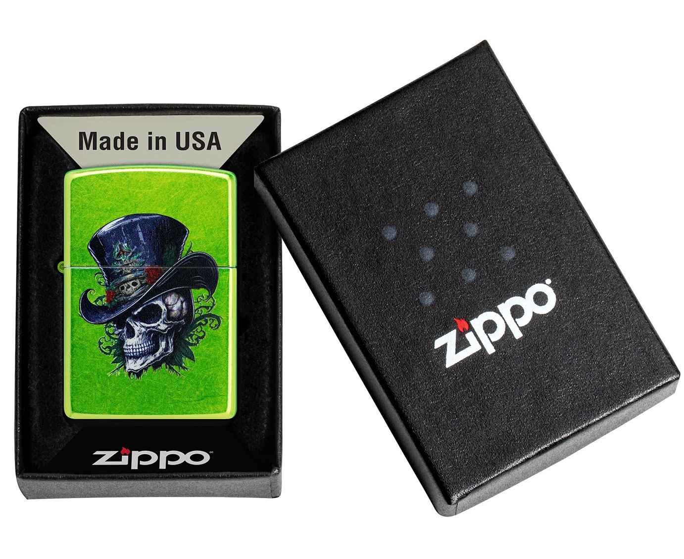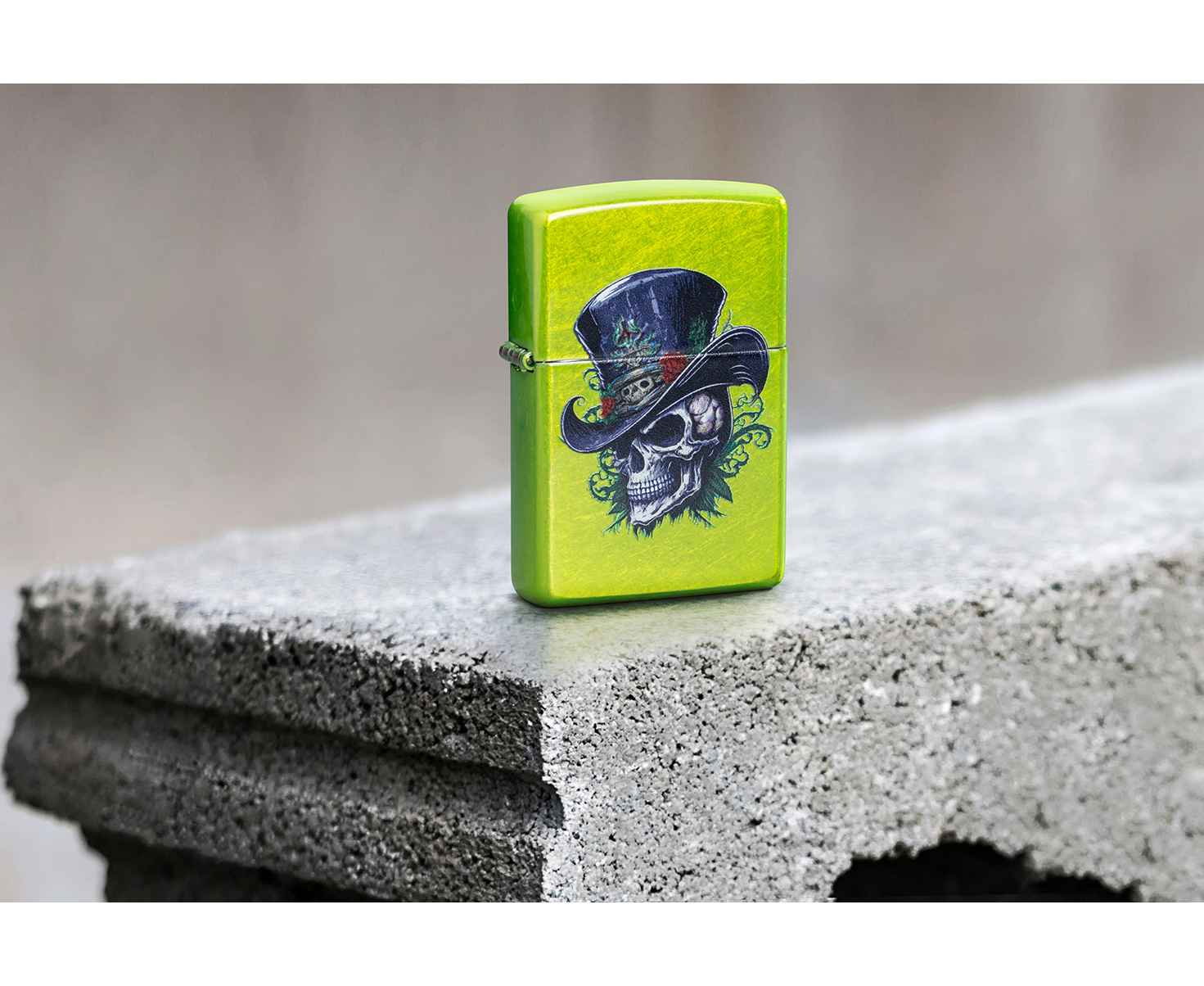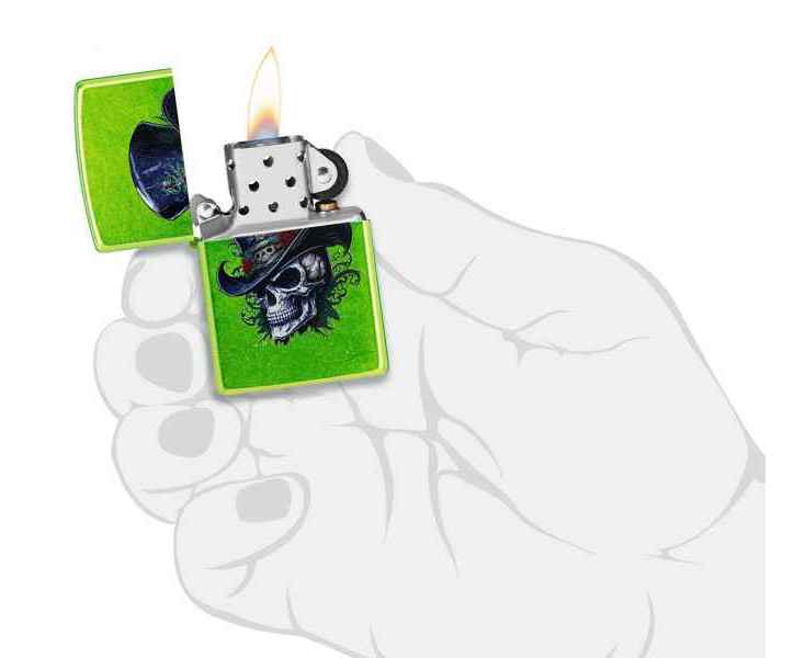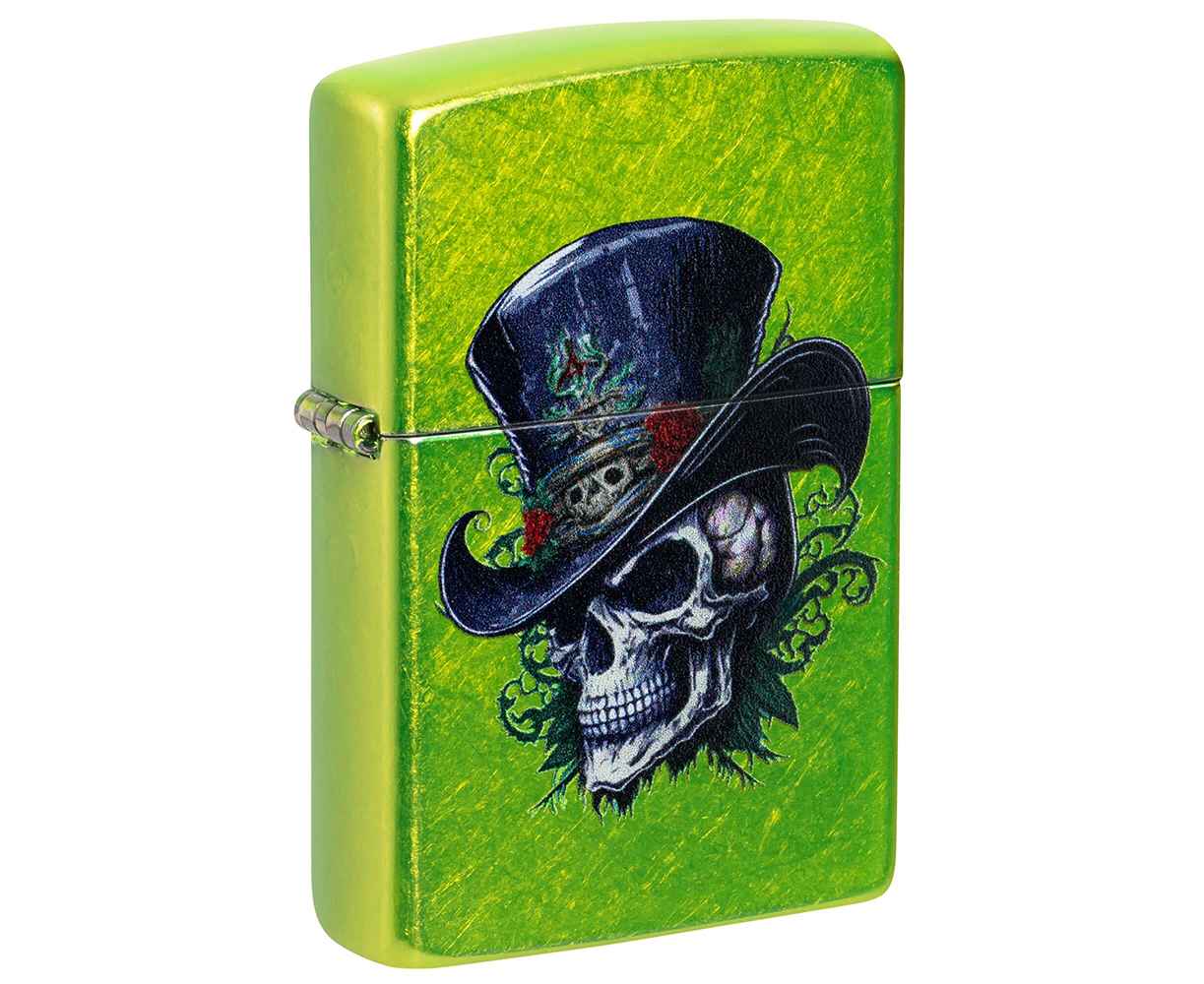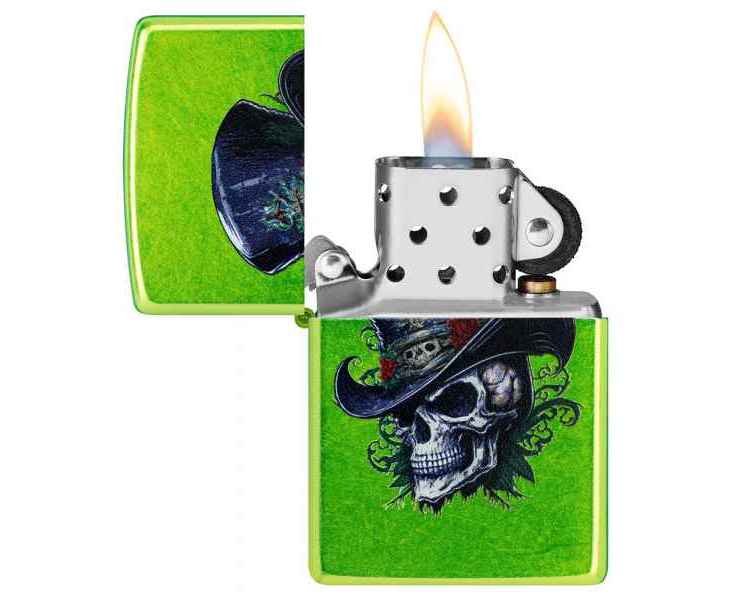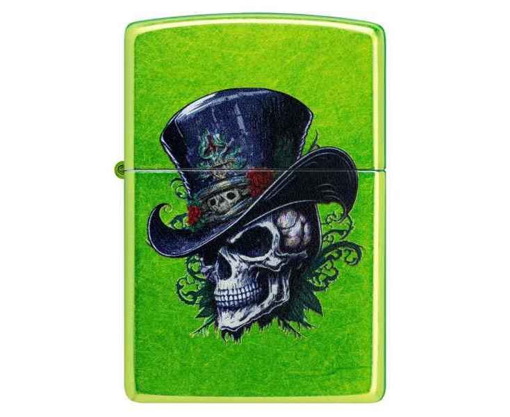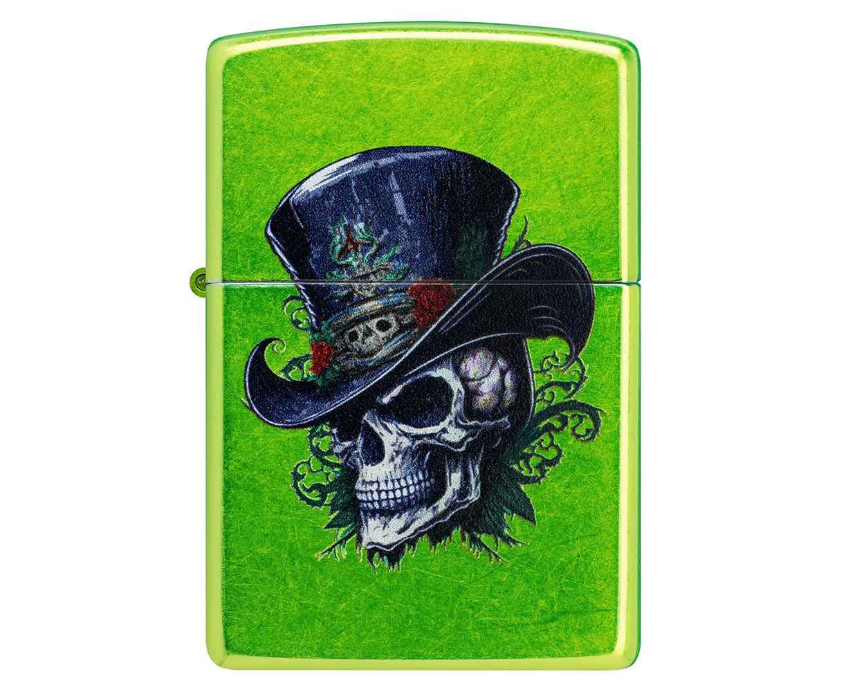 Зловещий череп в спортивной шляпе-цилиндре ярко и криво ухмыляется с классической зажигалке Lurid.