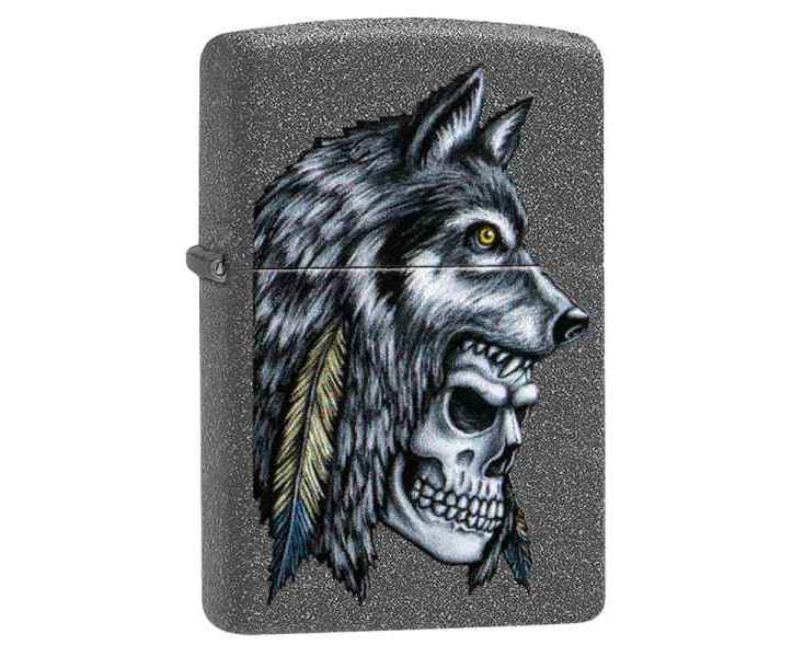 Зажигалка ZIPPO Wolf Skull Feather Design с покрытием Iron Stone™, латунь/сталь, серая, матовая, 38x13x57 мм