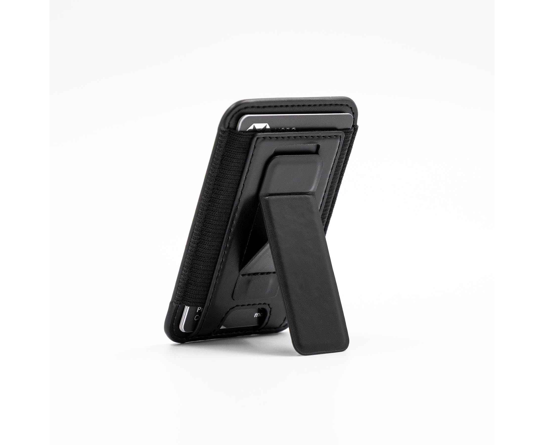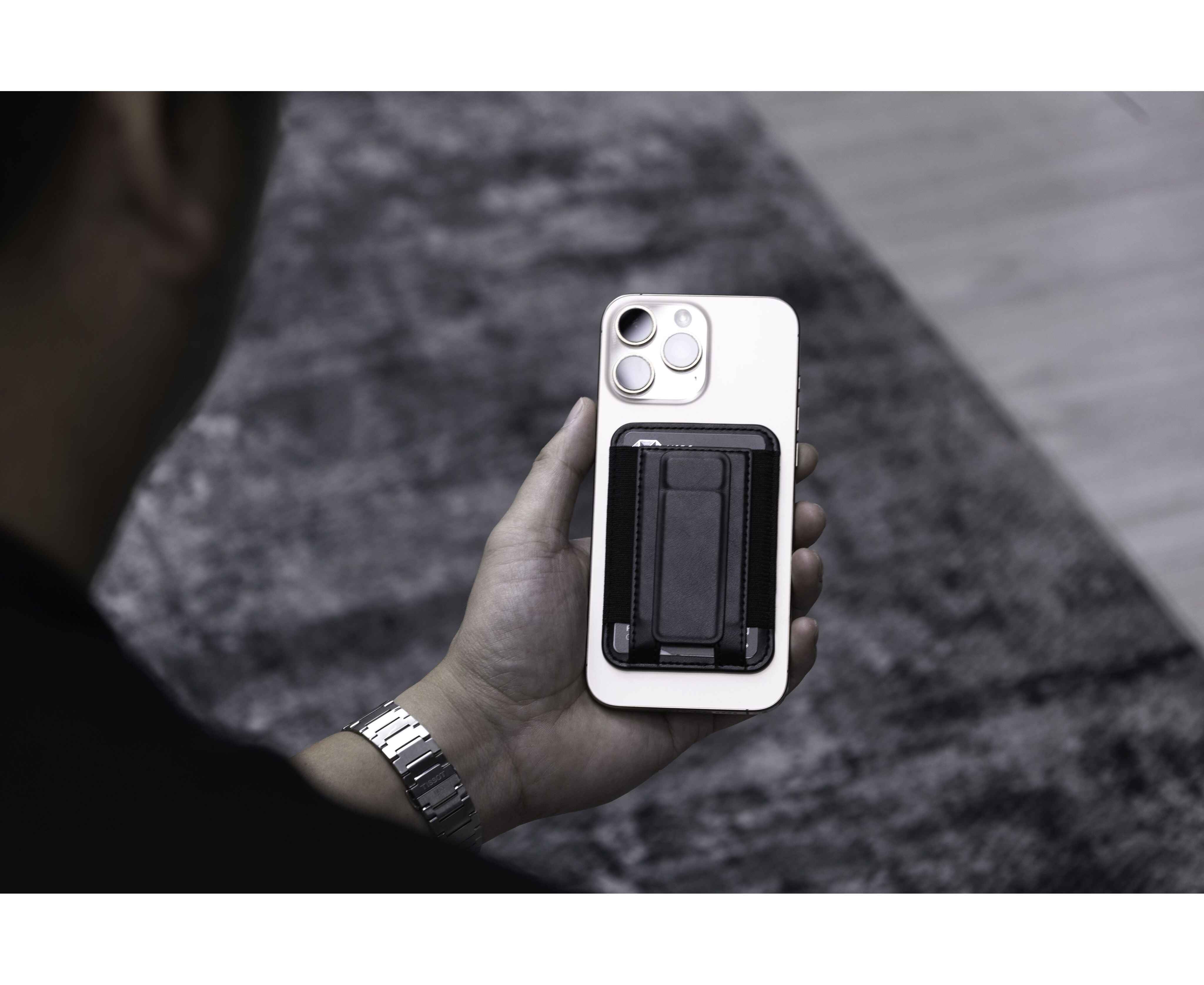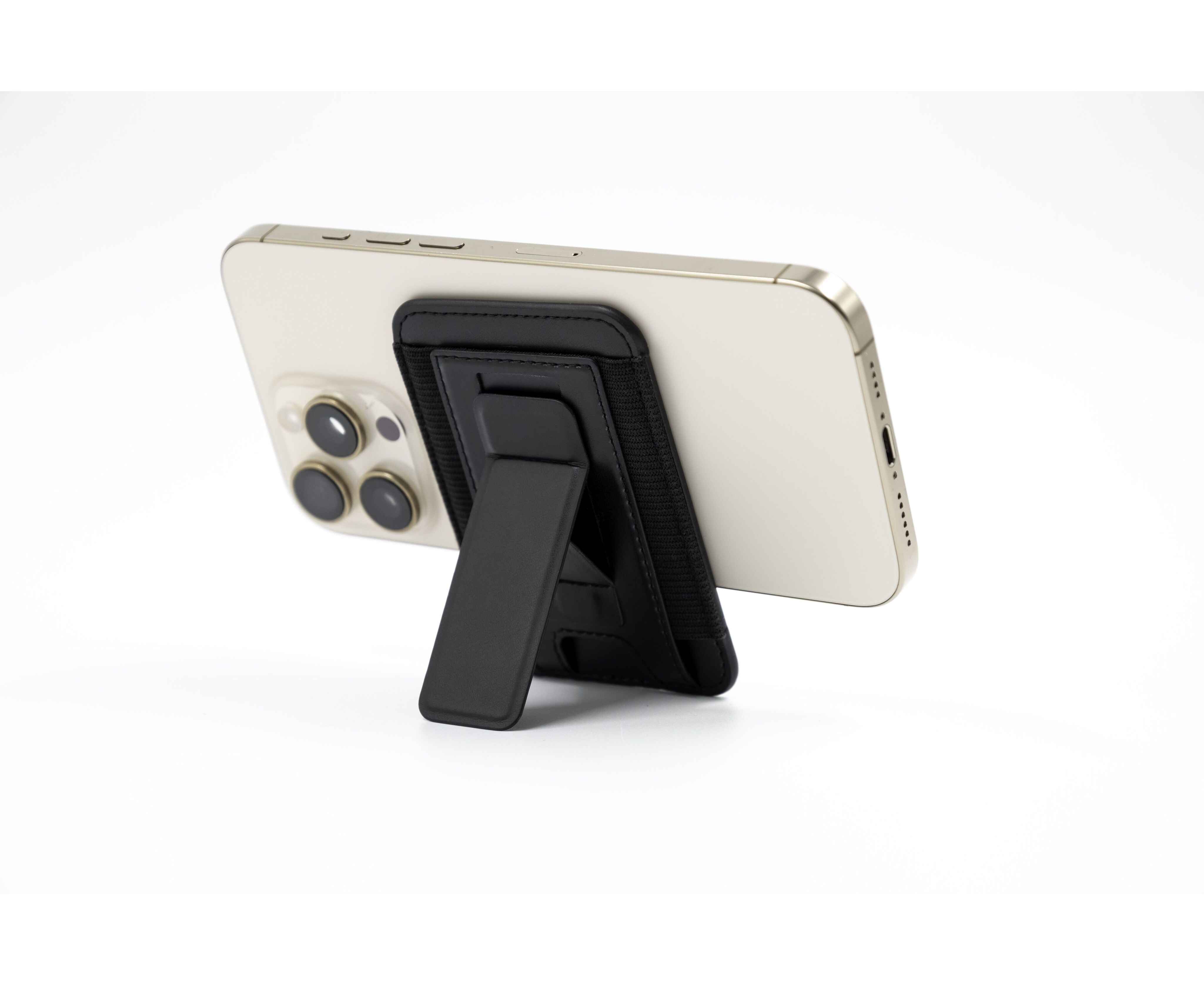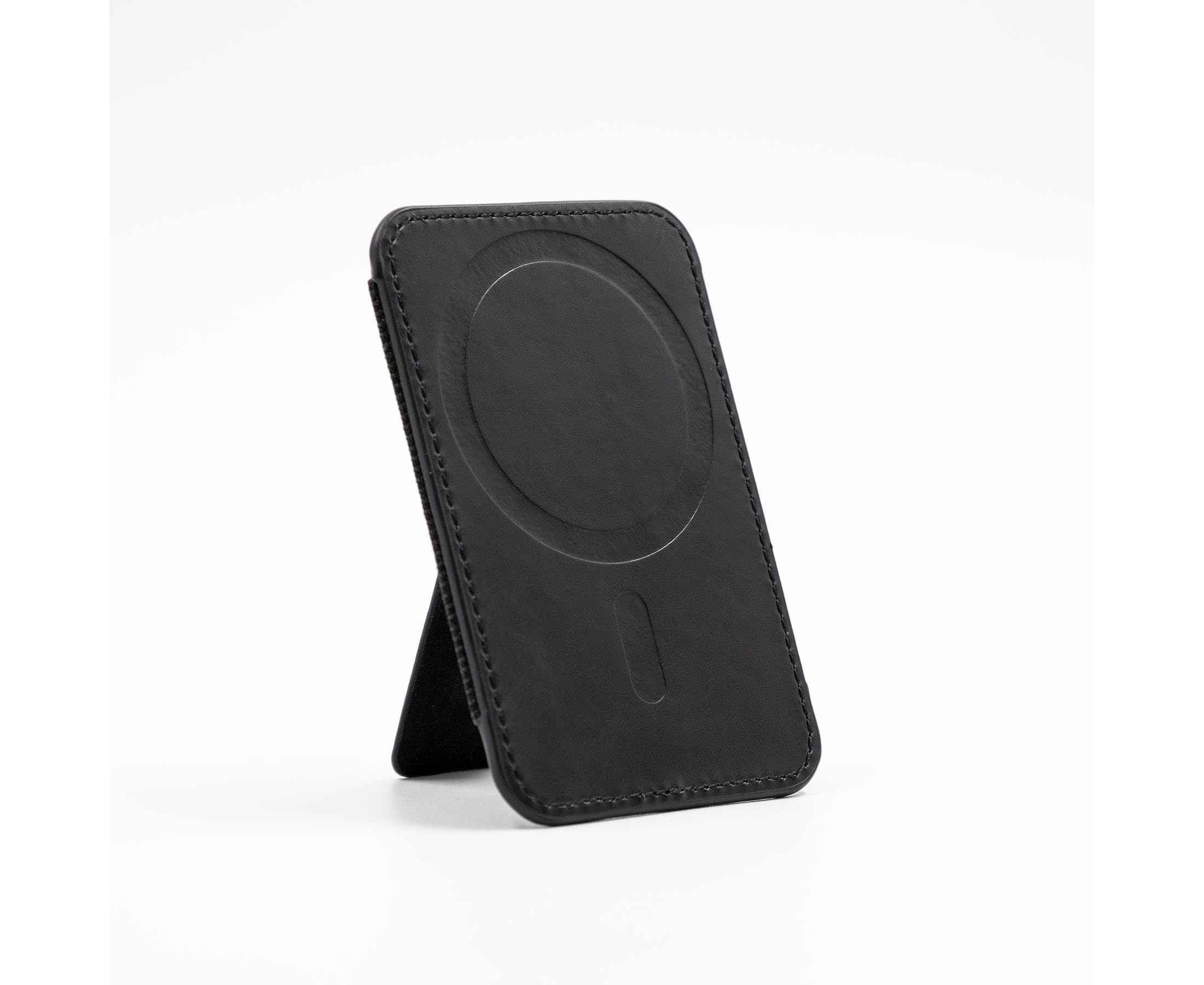 Кардхолдер изготовлен из переработанной искусственной кожи (PU), надёжно крепится к смартфону с помощью MagSafe, вмещает до 6 карт, а при раскрытии превращается в подставку для телефона с возможностью установки в вертикальном или горизонтальном положении.