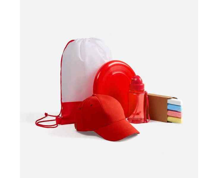 Детский набор для творчества: 4 цветных мелка, бутылка для воды, стильная бейсболка с защитой от солнца, тарелка-фрисби для самых активных и яркий детский рюкзак-мешок — все, что нужно для творческих приключений на свежем воздухе.