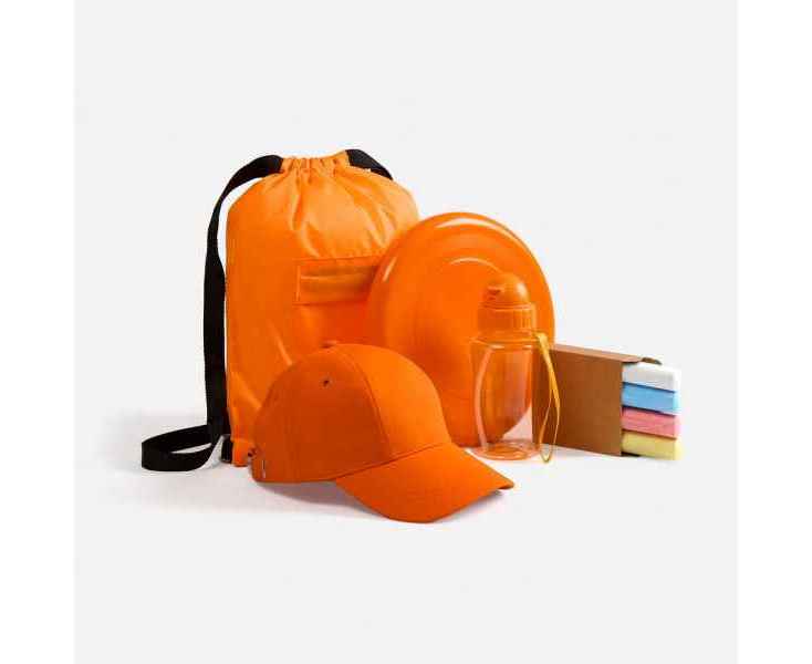 Детский набор для творчества: 4 цветных мелка, бутылка для воды, стильная бейсболка с защитой от солнца, тарелка-фрисби для самых активных и яркий детский рюкзак-мешок — все, что нужно для творческих приключений на свежем воздухе.