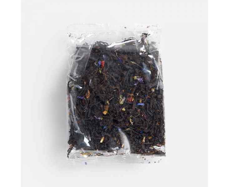 Состав: черный индийский чай, сушеная клубника, клубничный лист, цветки василька, ароматизатор «клубника».