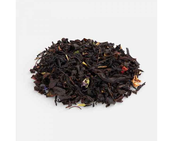 Праздничный купаж на основе черного чая, украшенный цветочными лепестками и кусочками клубники.