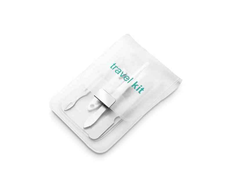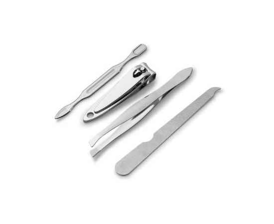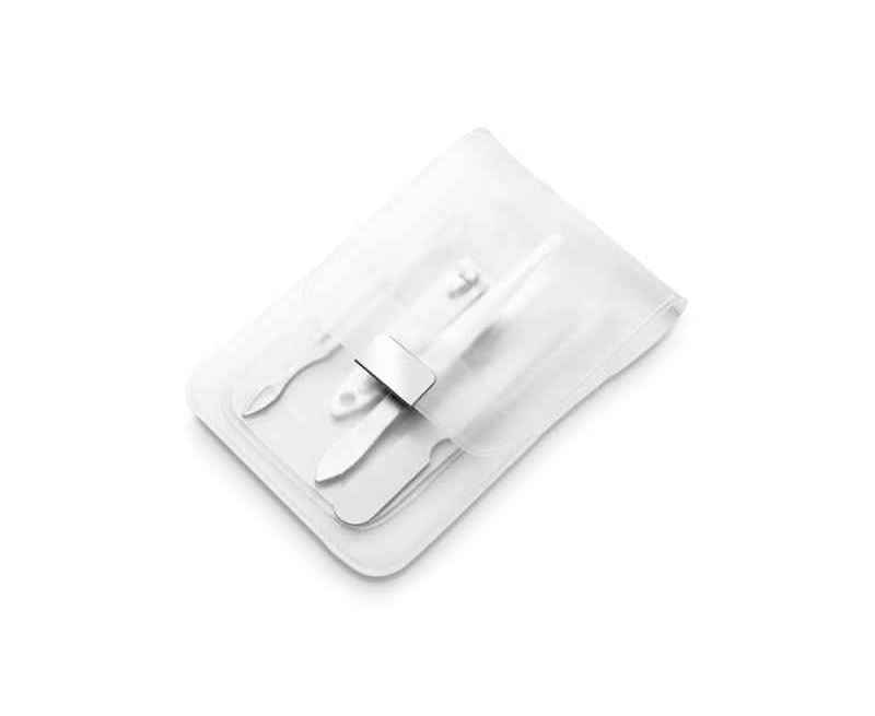 Набор из 4 предметов для маникюра в пакете из ПВХ, состоящий из пилочки, пинцета, щипчиков для ногтей и лопатки для кутикулы. 66 x 105 мм. Вид нанесения, рекомендуемый поставщиком: трафаретная печать, гравировка.