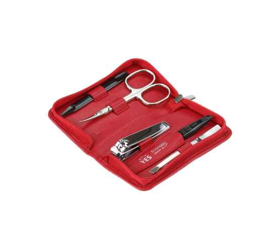 Маникюрный набор YES, 5 пр.: книпсер для ногтей, ножницы для кутикулы, пинцет скошенный, пилка металлическая, шабер двусторонний. Футляр: натуральная кожа, цвет красный. Размеры 10 х 6,5 х 2,5 см