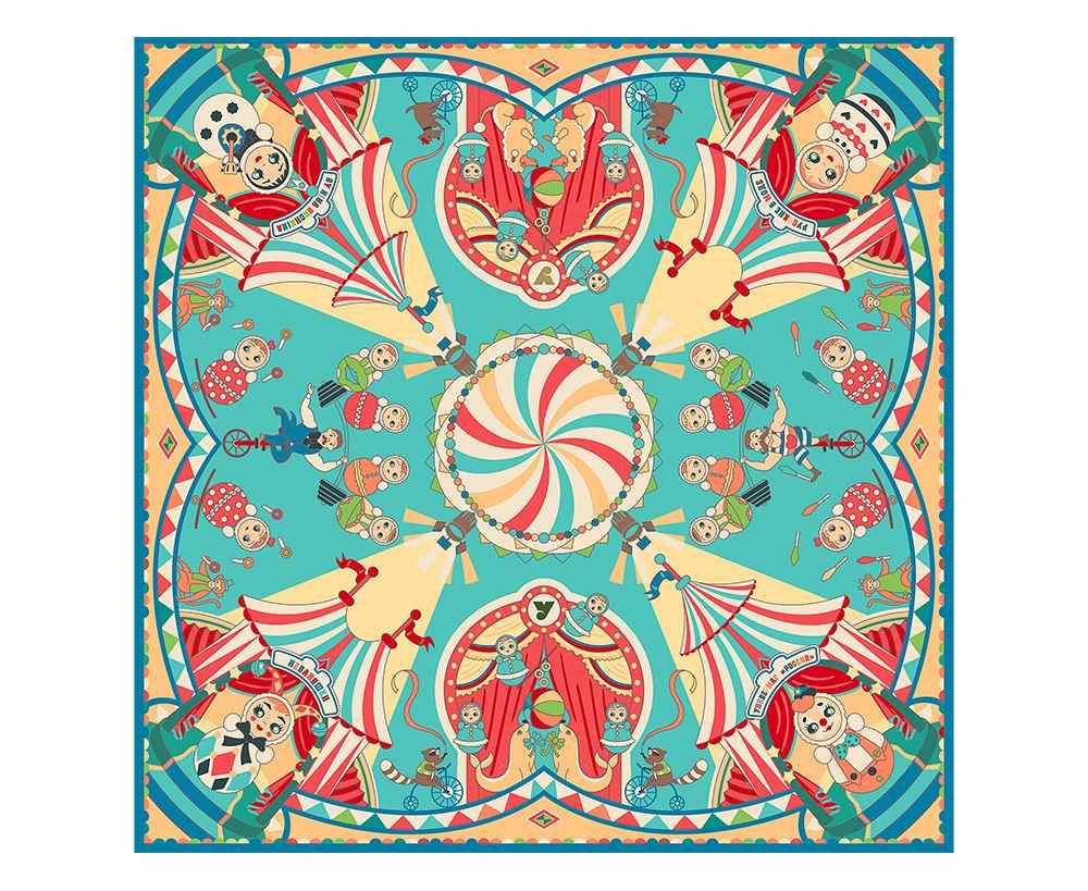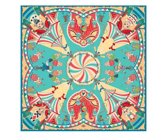 На полотне воплощена добрая атмосфера народного веселья и волшебства, где каждый рисунок напомнит о сказках, ярмарках и лубочных иллюстрациях. В центре лучится купол цирка, разноцветный словно леденец, а вокруг раскинулись нарядные шатры. В свете софитов запечатлены расписные образы игрушек, зверей, эквилибристов и силачей – уникальные и неповторимые, они образуют кружащийся танец.