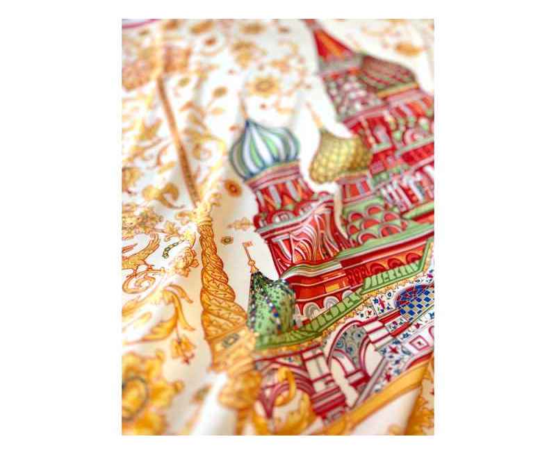 Сказочный вид собора отражен на золотом фоне новинки от бренда Русские в моде by Nina Ruchkina. Настоящее восьмое чудо Света обрамлено царскими коронами и райскими птицами, свидетельствующими об уникальности и роскоши этой исторической достопримечательности, отстроенной 1 октября 1552 года на праздник Покрова Богородицы.