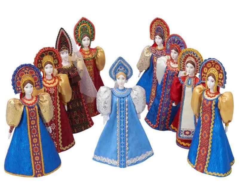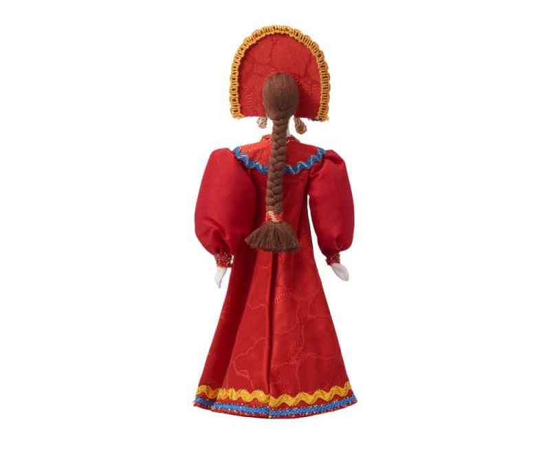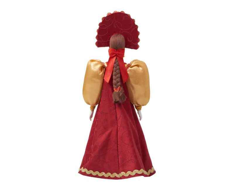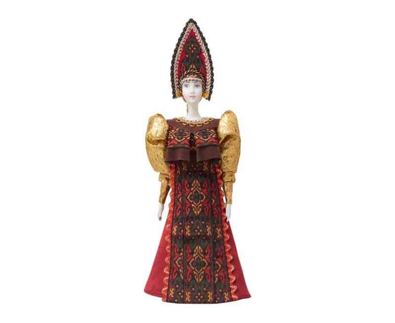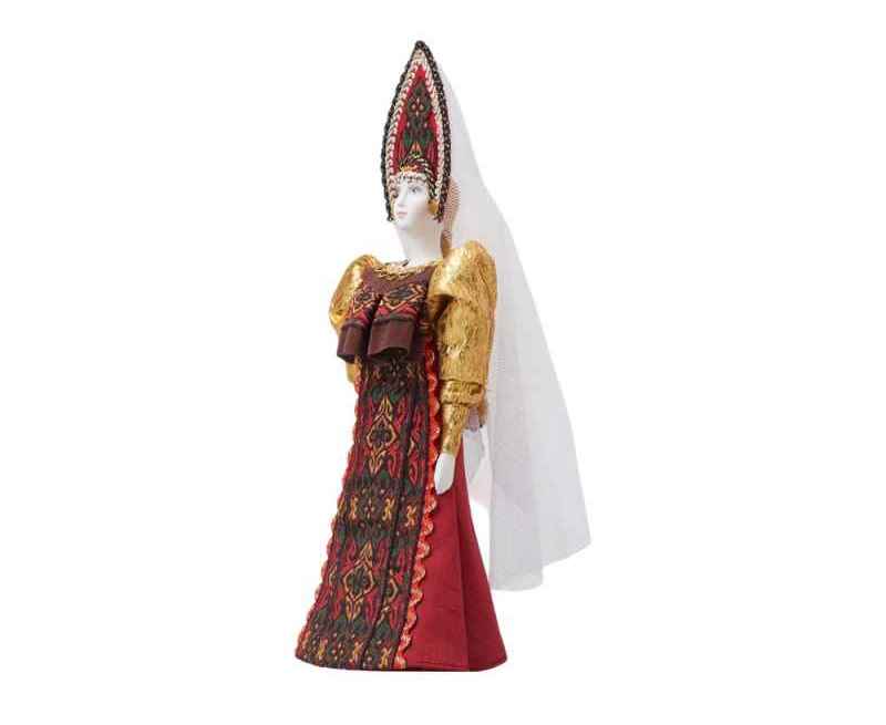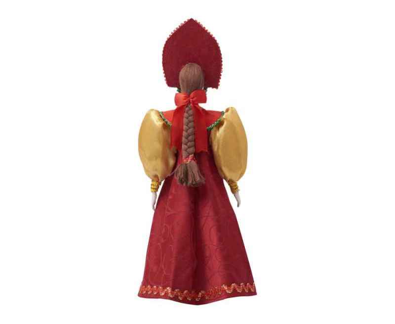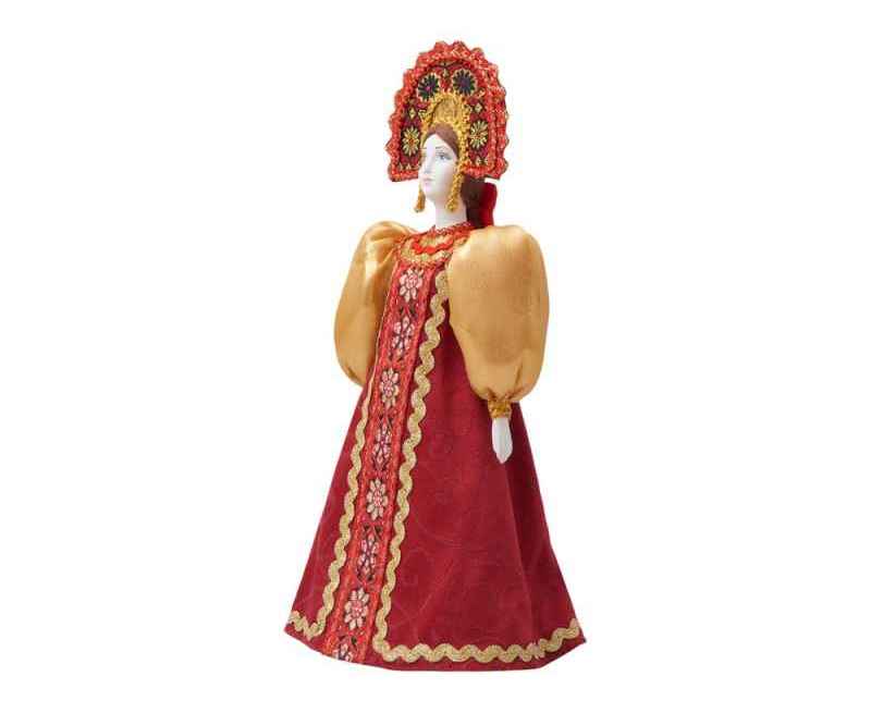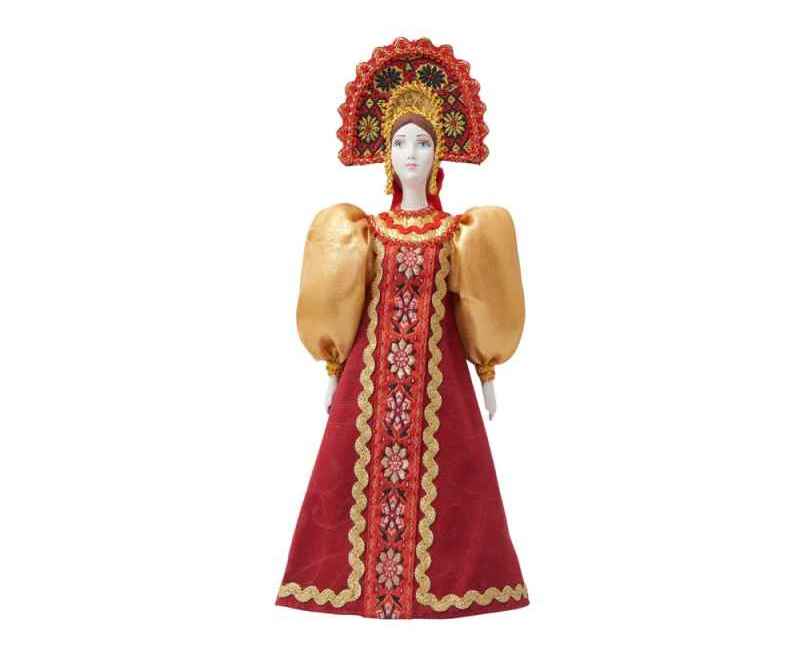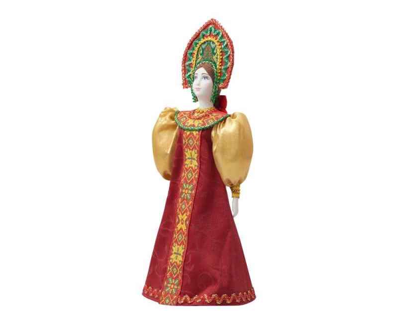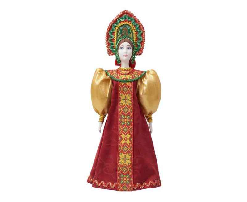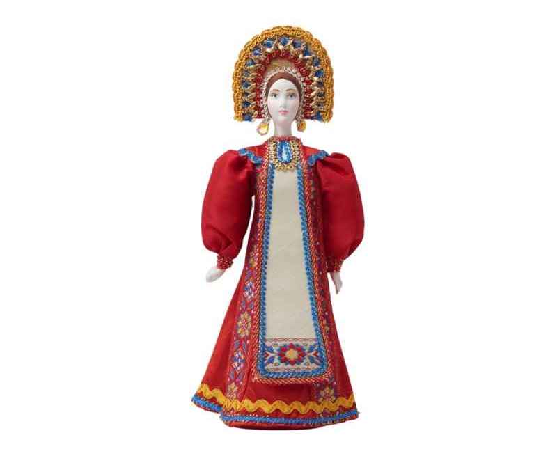 - Фарфоровая кукла в народном костюме ручной работы: алый сарафан с пышными рукавами и расшитый кокошник создают образ русской красавицы в праздничном наряде.