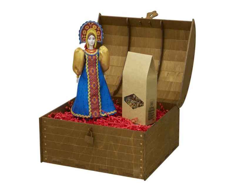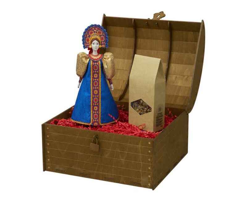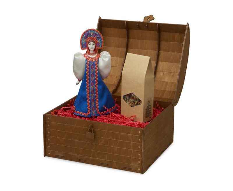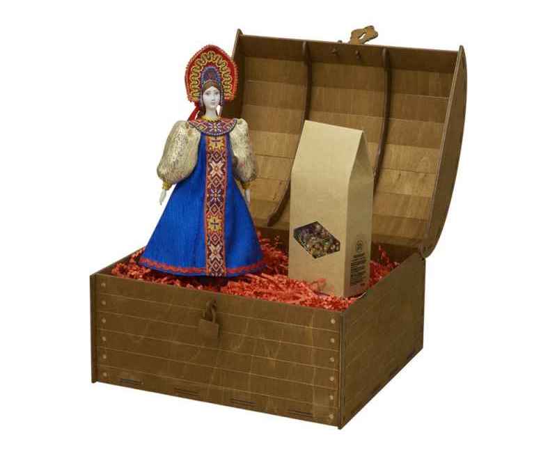 - Набор поставляется в большой деревянной коробке в виде сундука с замочком, который можно брендировать шильдом спектрум, что придает подарку особую атмосферу сокровища и делает его не только вкусным, но и памятным.