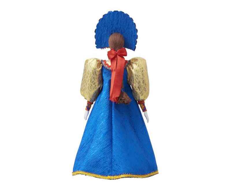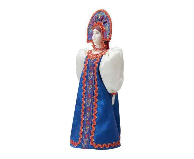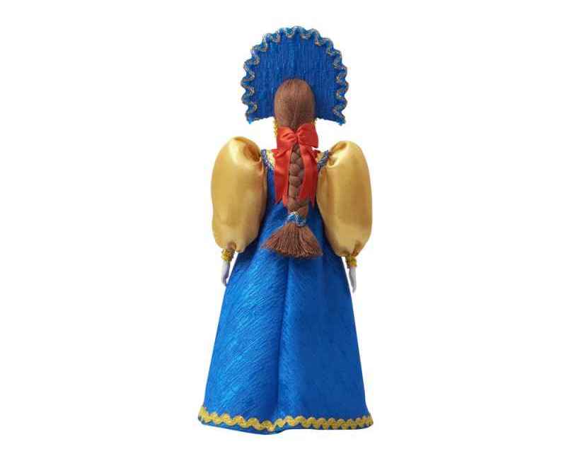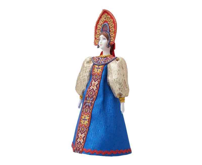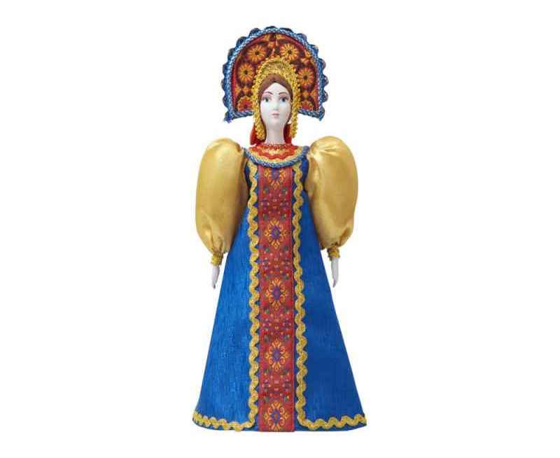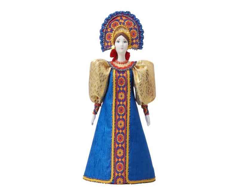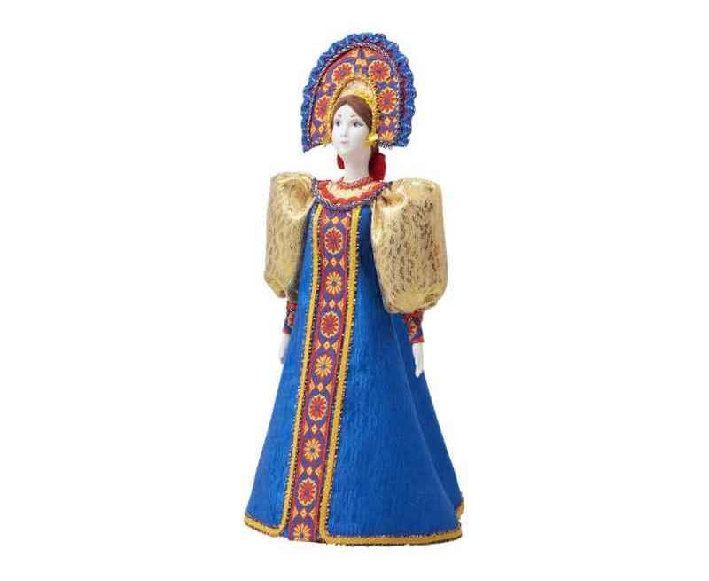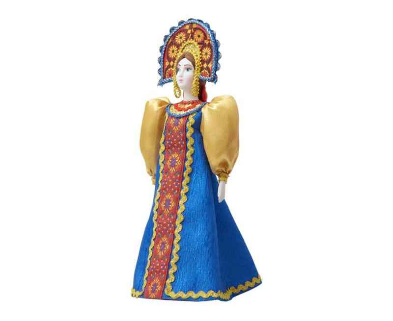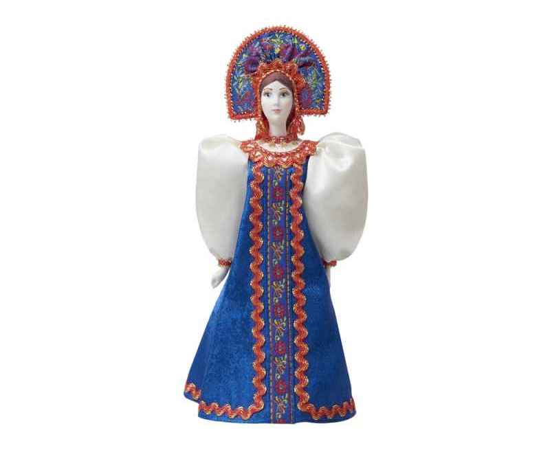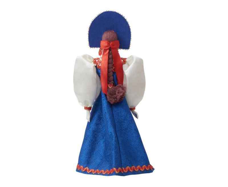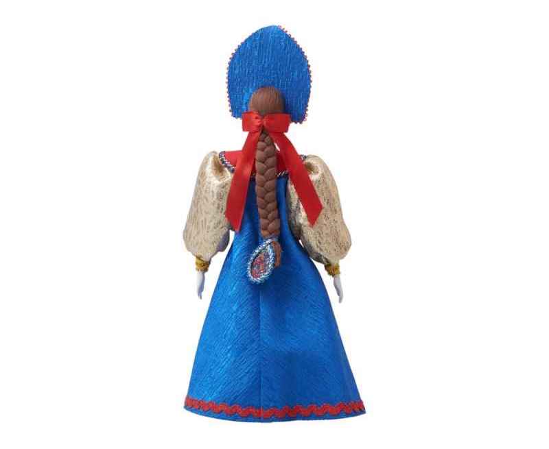 - Куклу ручной работы: сувенирная фарфоровая кукла в традиционном девичьем праздничном костюме. Яркий сарафан синего цвета, пышные рукава и кокошник с богатым декором отражают подлинный облик русского народного наряда.