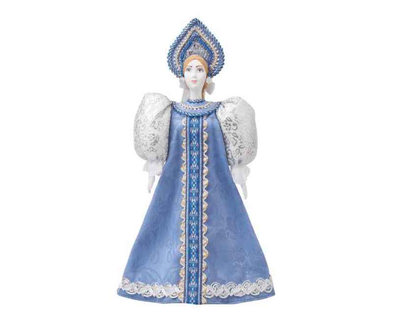 - Фарфоровая кукла в народном костюме: ручная работа, украшенная детализированным голубым сарафаном, воздушными белыми рукавами и нарядным кокошником с узорами. Кукла воплощает эстетику старинных русских праздников.