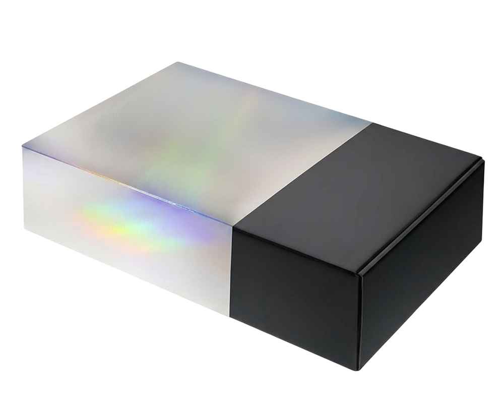 Подарочная коробка из прочного микрогофрокартона, кашированная бумагой с матовой ламинацией, выглядит элегантно и надёжно защищает содержимое. Новогодний голографический шубер с мерцающими серебристыми переливами придаёт ей праздничный блеск и делает каждый подарок по-настоящему особенным.