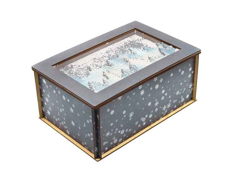 Новогодняя упаковка 'Лес в снегу' — это прямоугольная деревянная коробка темного цвета, оформленная в зимнем лесном стиле с изображением снежных деревьев. Её элегантный и атмосферный дизайн создаёт ощущение зимней сказки, делая её идеальной для хранения подарков или сладостей. Отличается стильным внешним видом и добавляет праздничное настроение в новогодние торжества.
