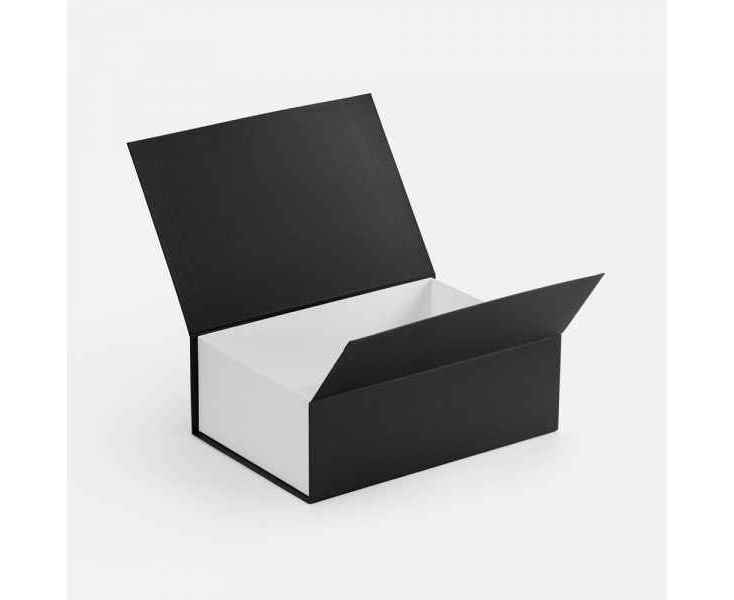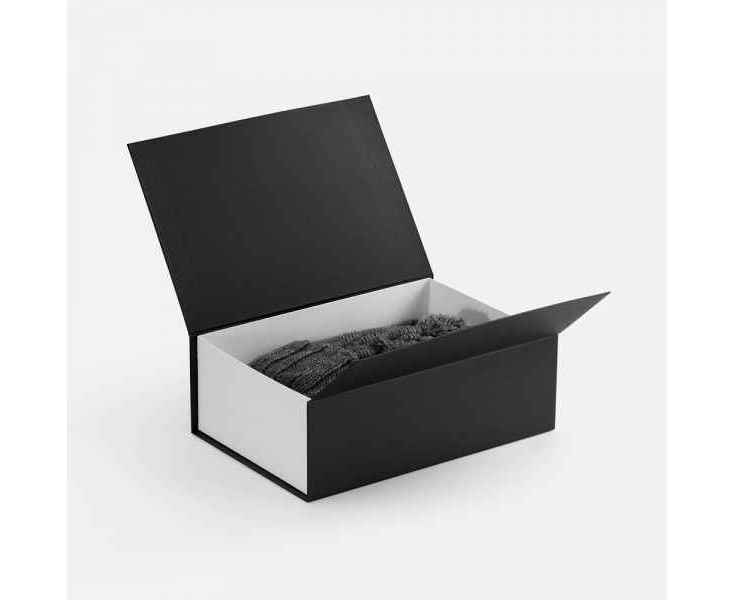 Коробка с клапаном на магните выполнена из переплетного картона, кашированной гладкой дизайнерской бумагой Мalmero двух цветов.
