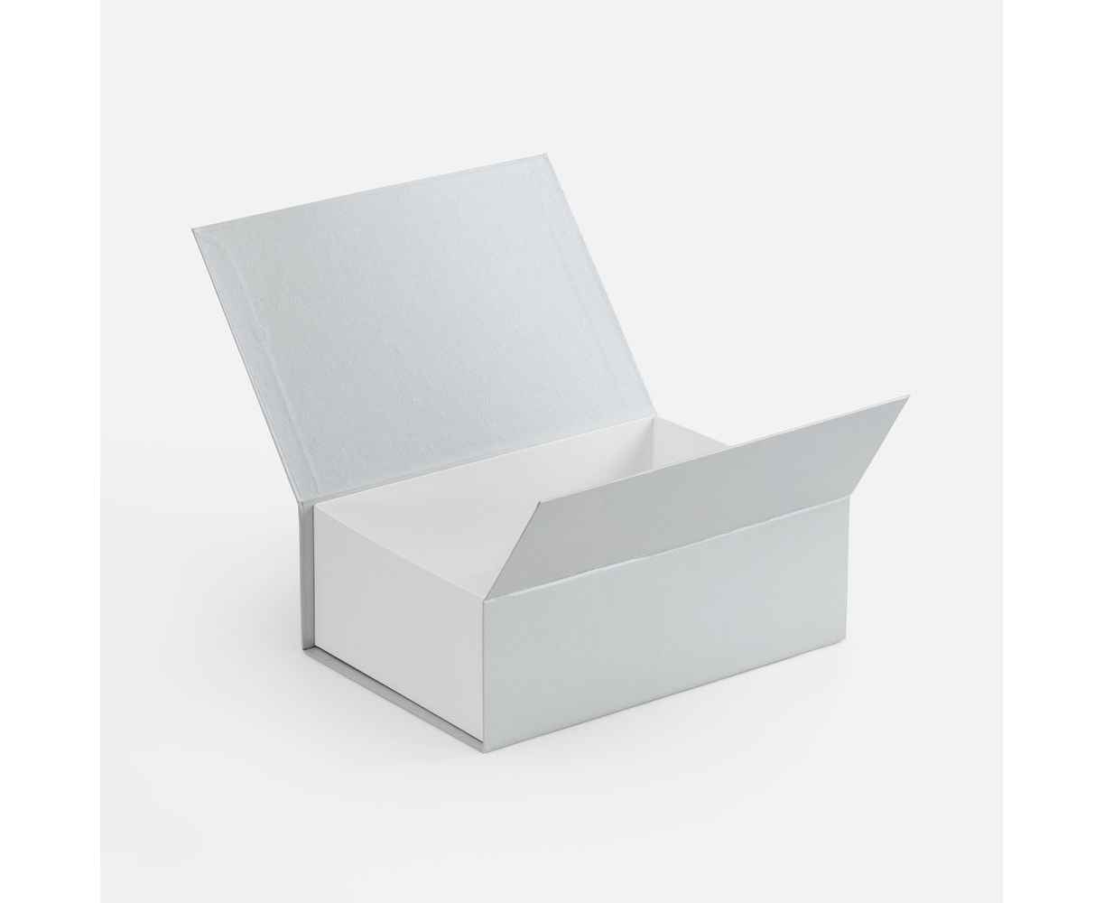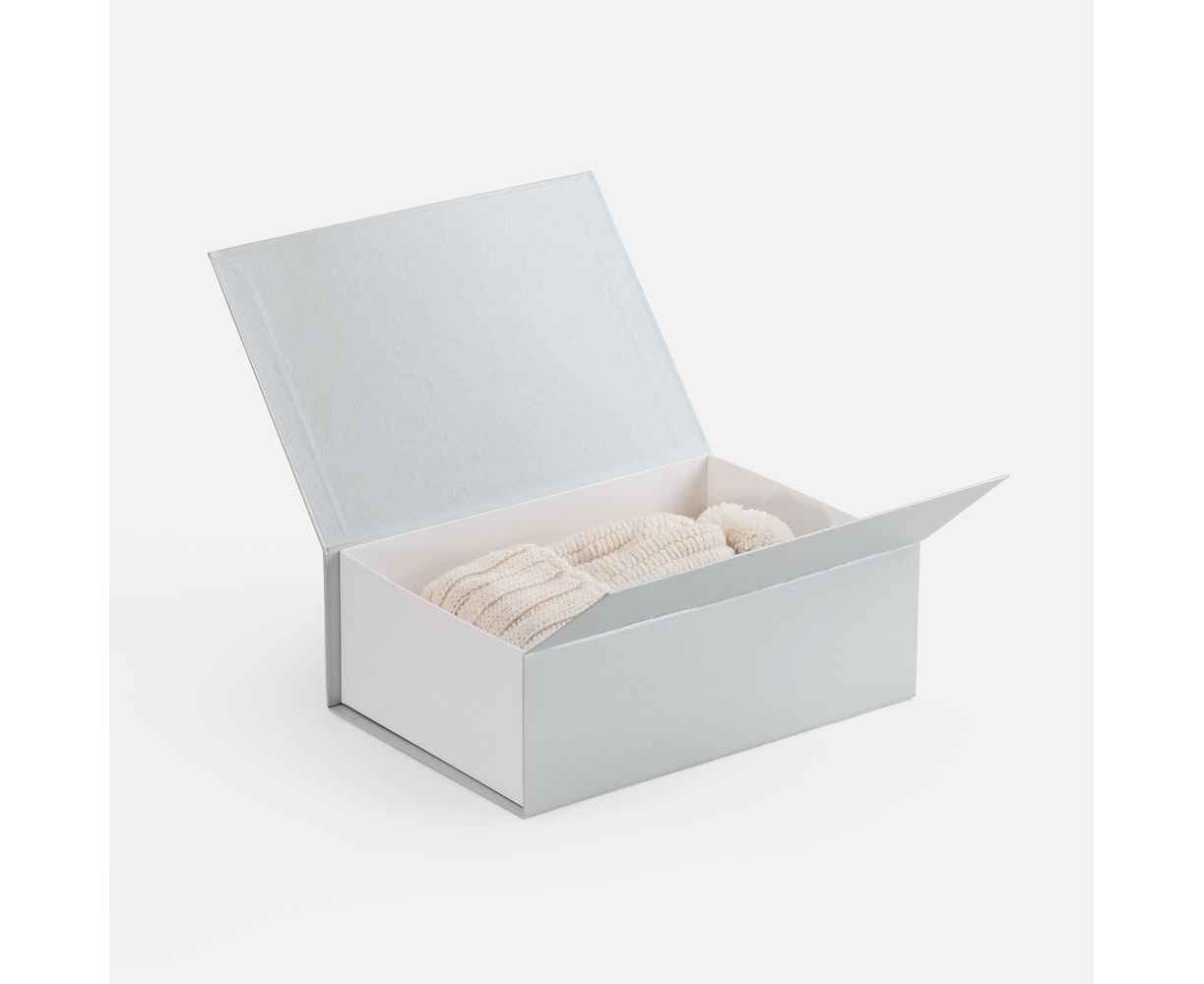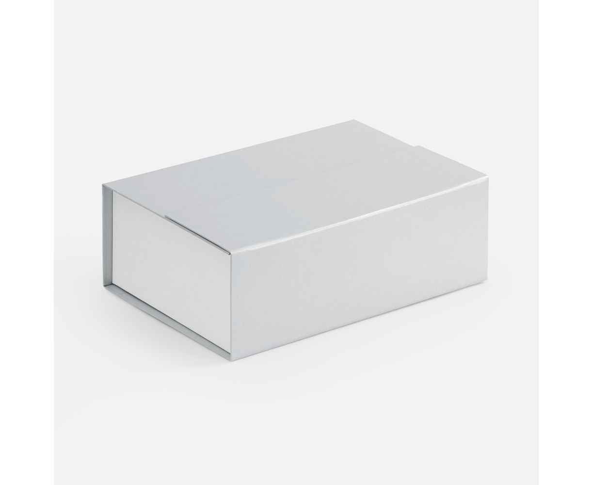 Коробка выполнена из переплетного картона, кашированной гладкой дизайнерской бумагой Мalmero двух цветов.