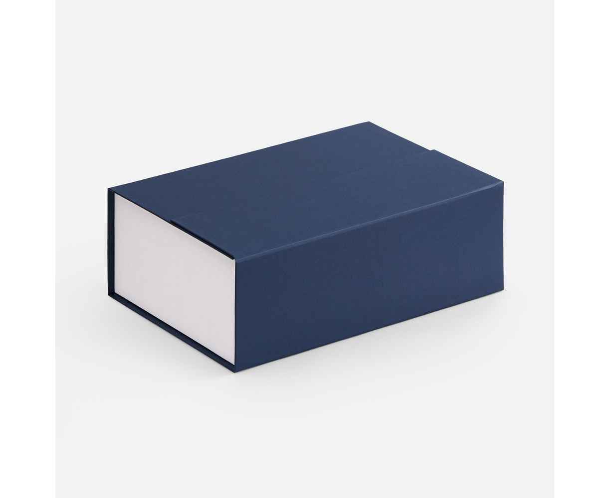 Коробка выполнена из переплетного картона, кашированной гладкой дизайнерской бумагой Мalmero двух цветов.