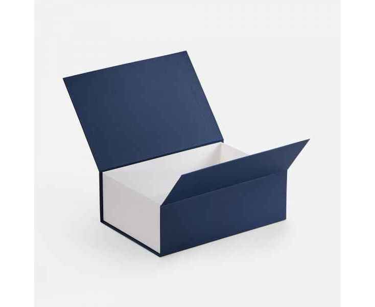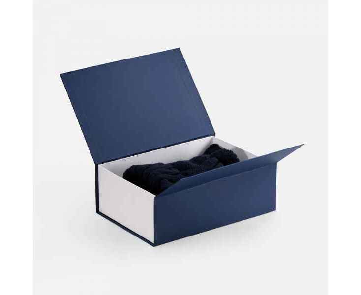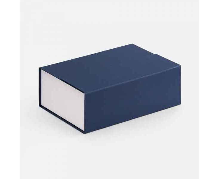 Коробка с клапаном на магните выполнена из переплетного картона, кашированной гладкой дизайнерской бумагой Мalmero двух цветов.
