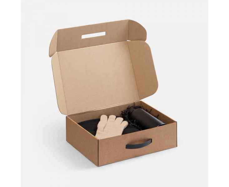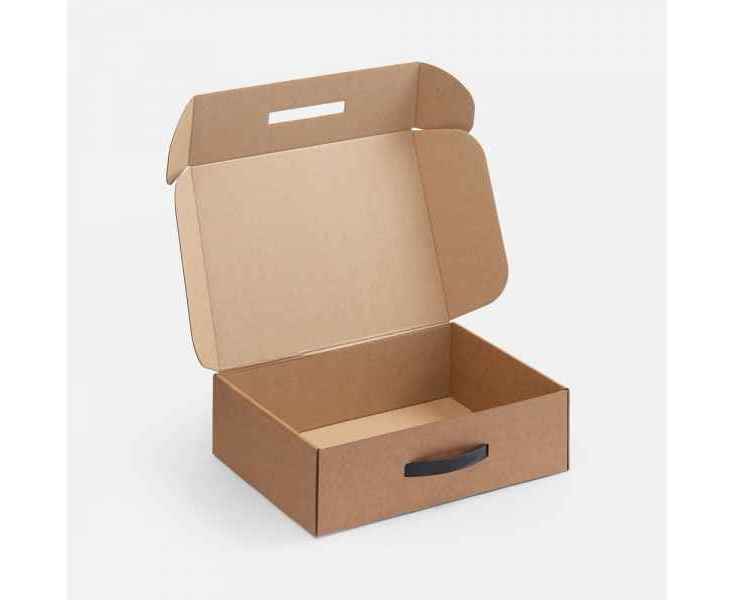 Самосборная коробка-шкатулка со вставной пластиковой ручкой.