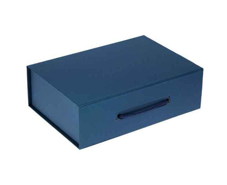 Коробка выполнена из переплетного картона, кашированного дизайнерской бумагой Malmero «Благородный синий», с крышкой на магните.