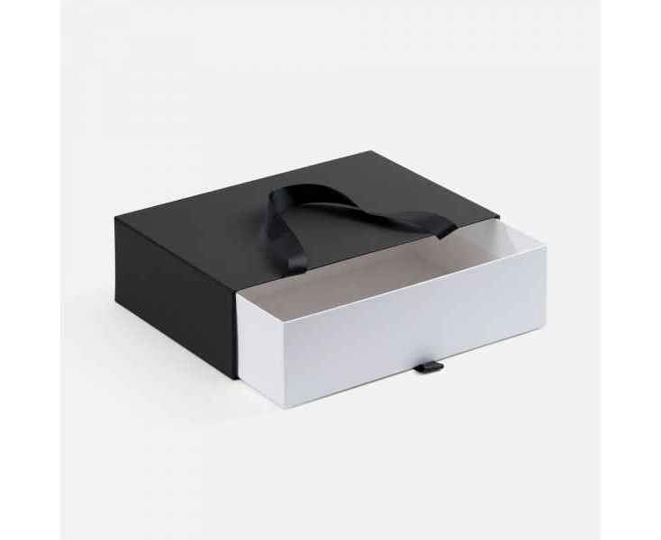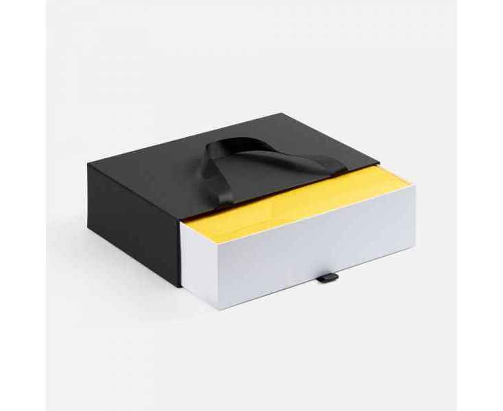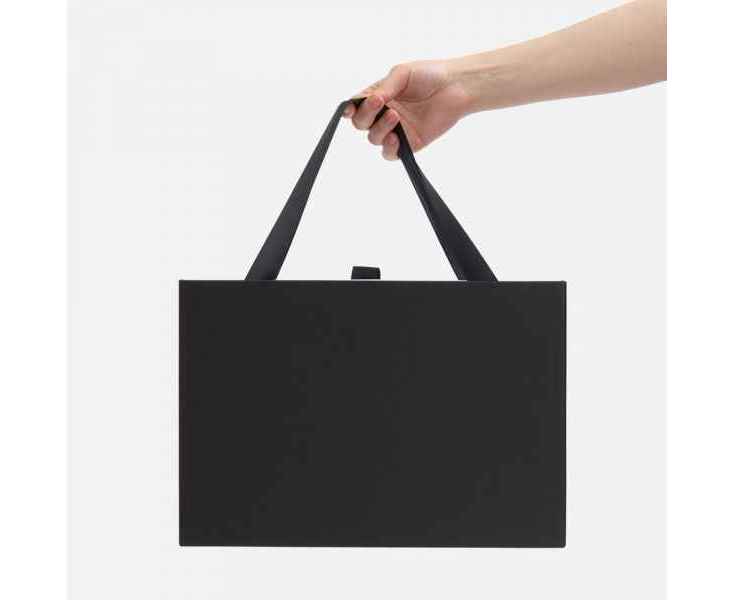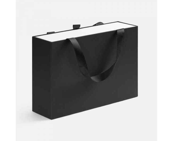 Внешний короб каширован дизайнерской бумаги и оснащен прочными ручками из репсовой ленты. Внутренний короб отделан белой бумагой, ламинированной матовой пленкой.