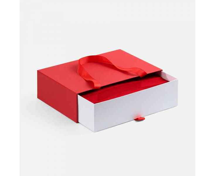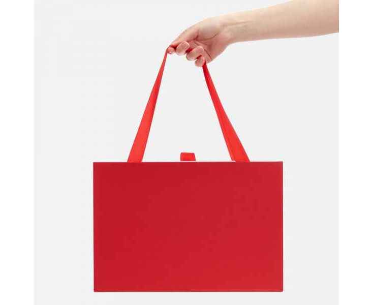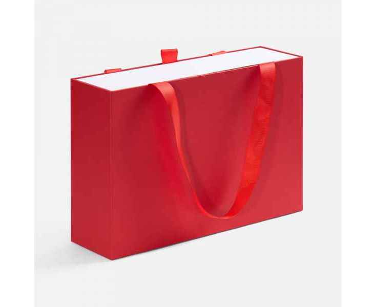 Внешний короб каширован дизайнерской бумаги и оснащен прочными ручками из репсовой ленты. Внутренний короб отделан белой бумагой, ламинированной матовой пленкой.