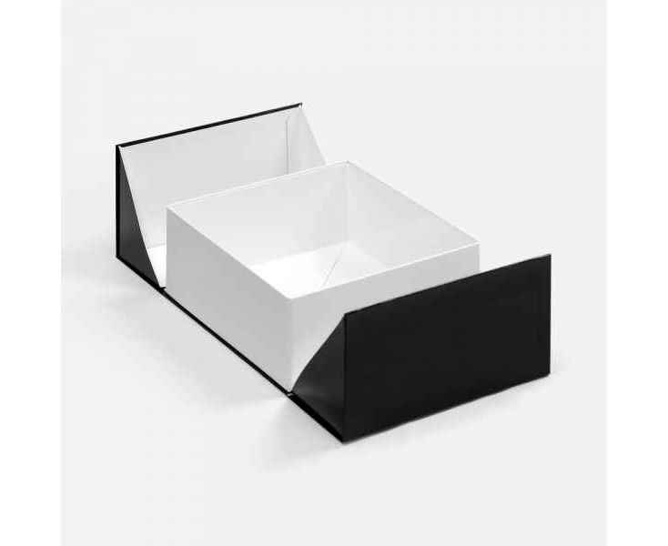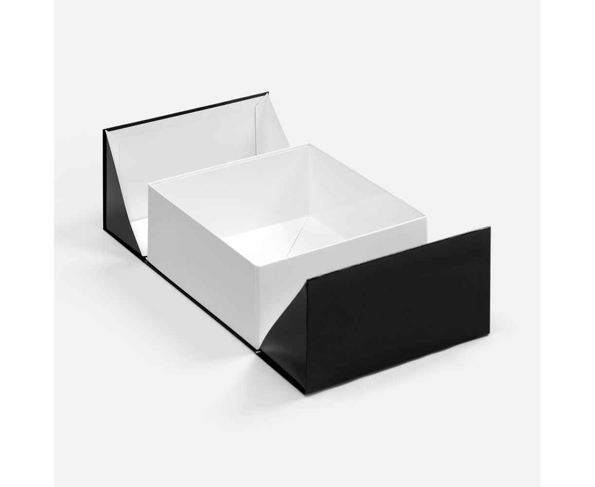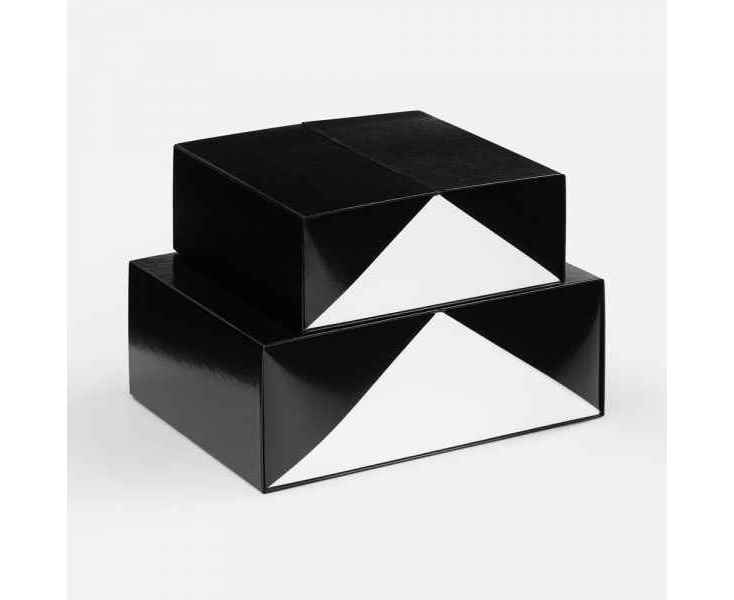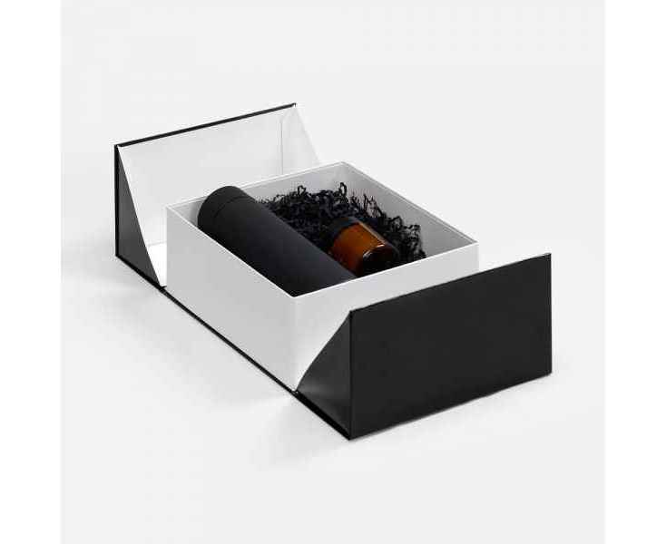 Коробка из переплетного картона 2 мм с оригинальной конструкцией: две симметричные створки открываются, создавая эффектную презентацию содержимого. Складная система на предустановленный двусторонний скотч делает сборку коробки быстрой и интуитивно понятной.