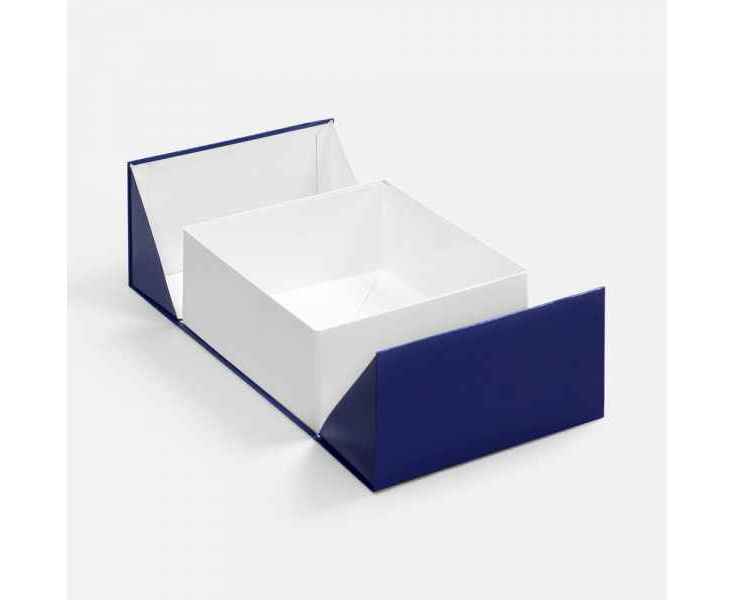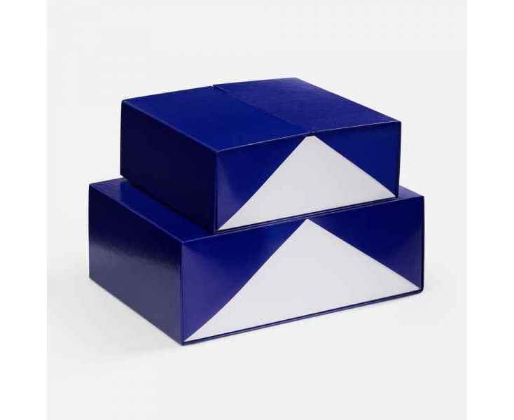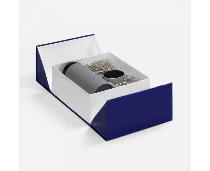 Коробка из переплетного картона 2 мм с оригинальной конструкцией: две симметричные створки открываются, создавая эффектную презентацию содержимого. Складная система на предустановленный двусторонний скотч делает сборку коробки быстрой и интуитивно понятной.
