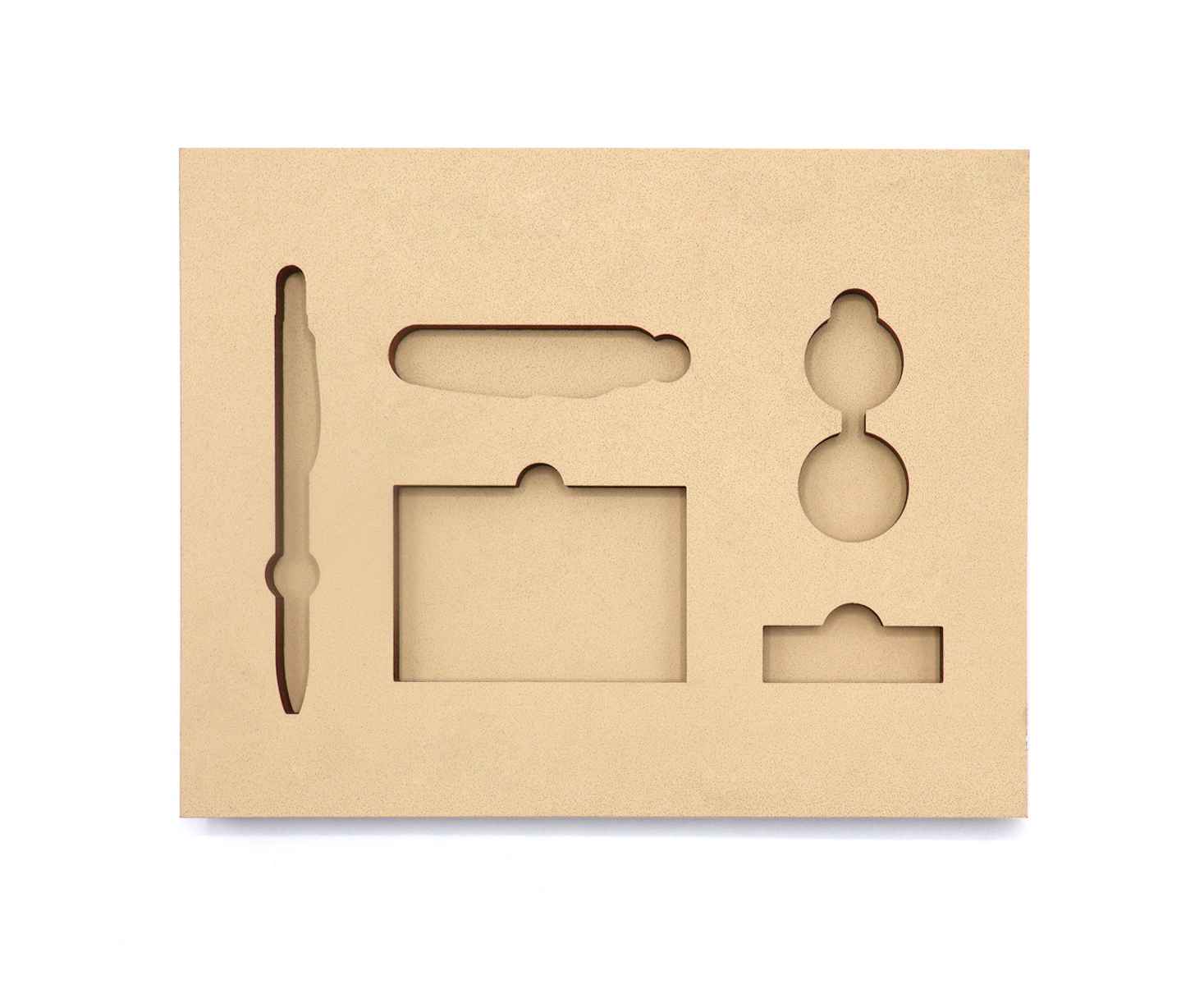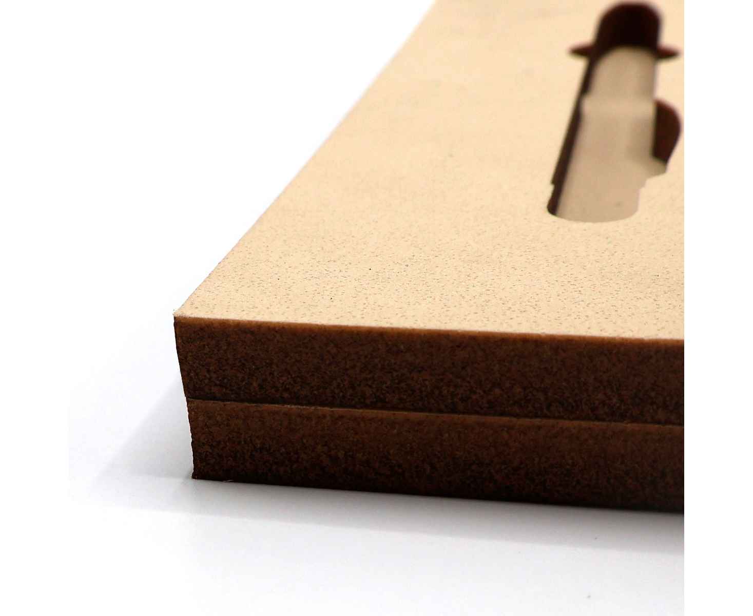 Ложемент, выполненный из бежевого ЭВА материала, представляет собой многослойную конструкцию, состоящую из двух слоев: нижнего толщиной 10 мм и верхнего — 10 мм. Согласно утвержденному макету, проемы для размещения предметов могут быть расположены как в одном, так и в обоих слоях.