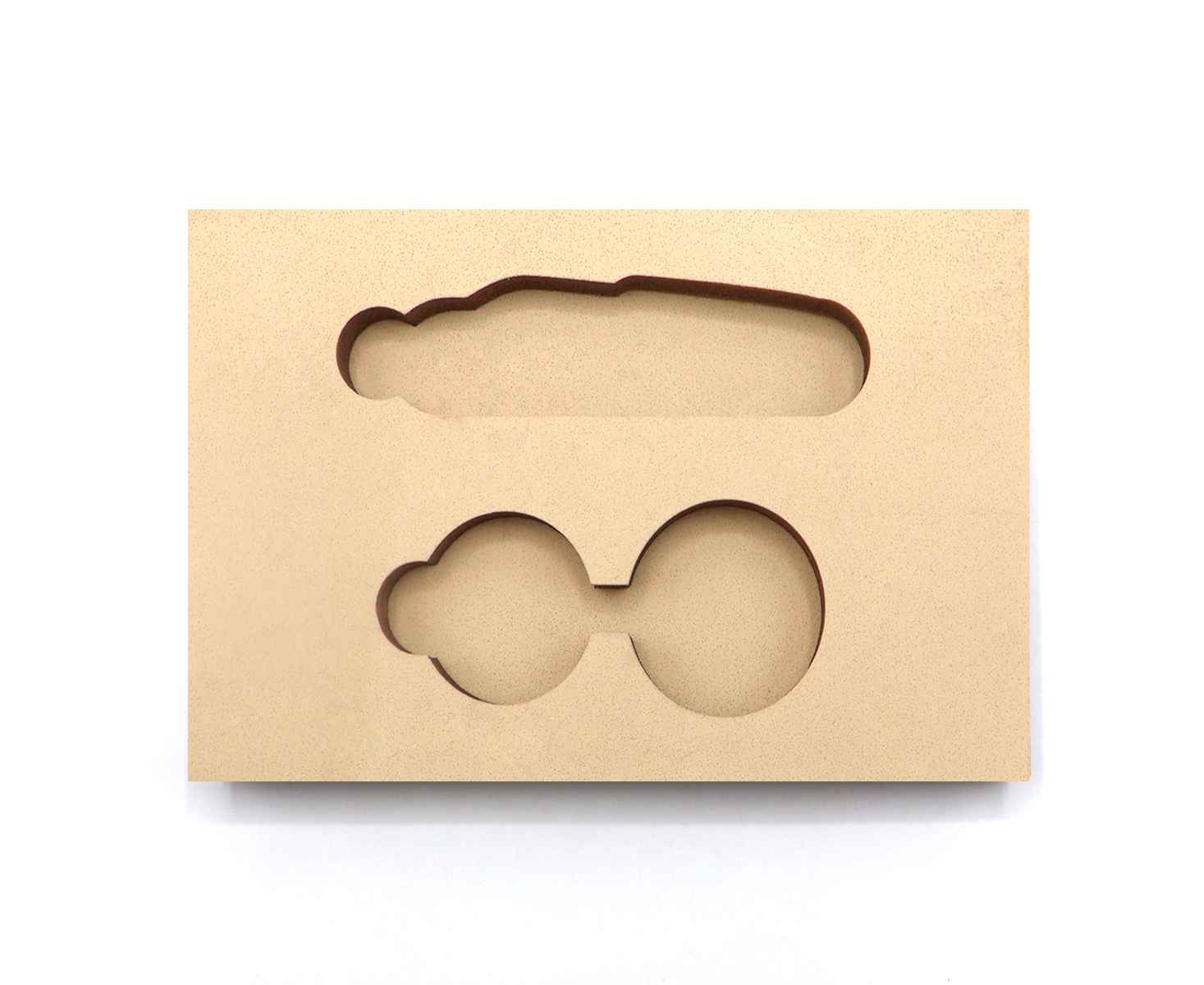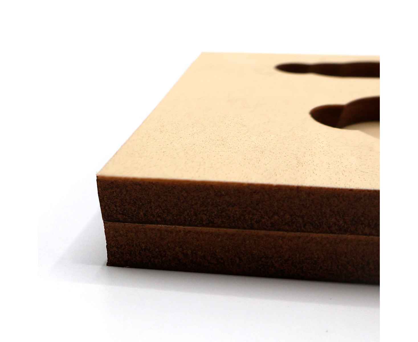 Ложемент, выполненный из бежевого ЭВА материала, представляет собой многослойную конструкцию, состоящую из двух слоев: нижнего толщиной 10 мм и верхнего — 10 мм. Согласно утвержденному макету, проемы для размещения предметов могут быть расположены как в одном, так и в обоих слоях.
