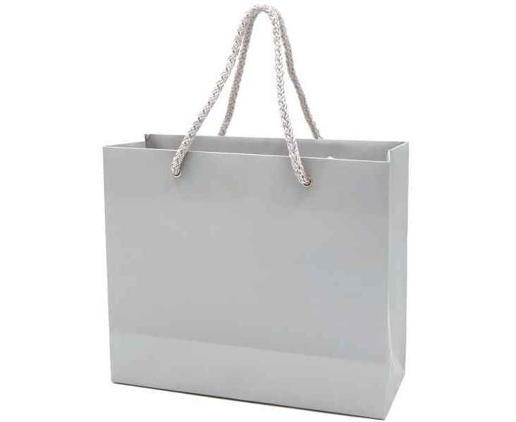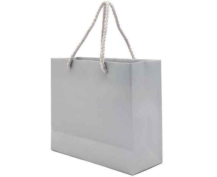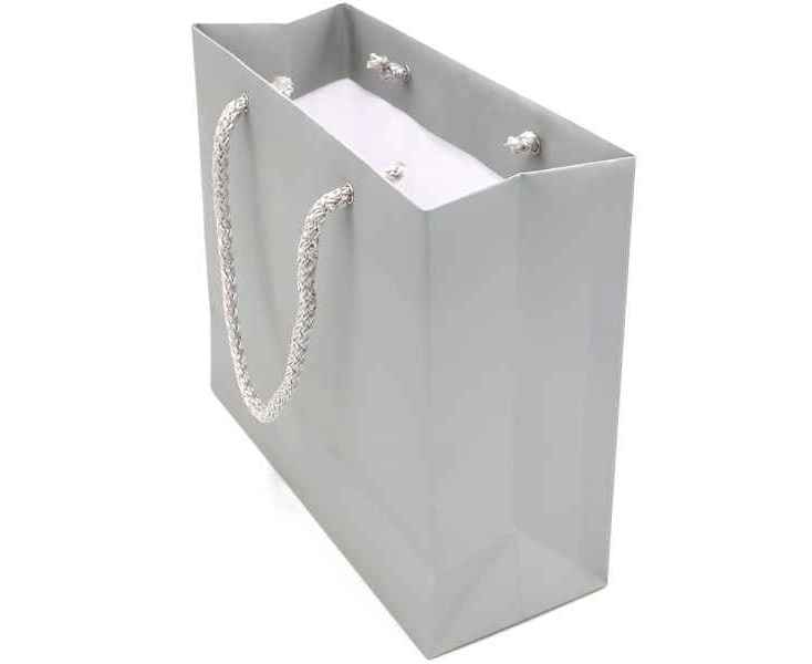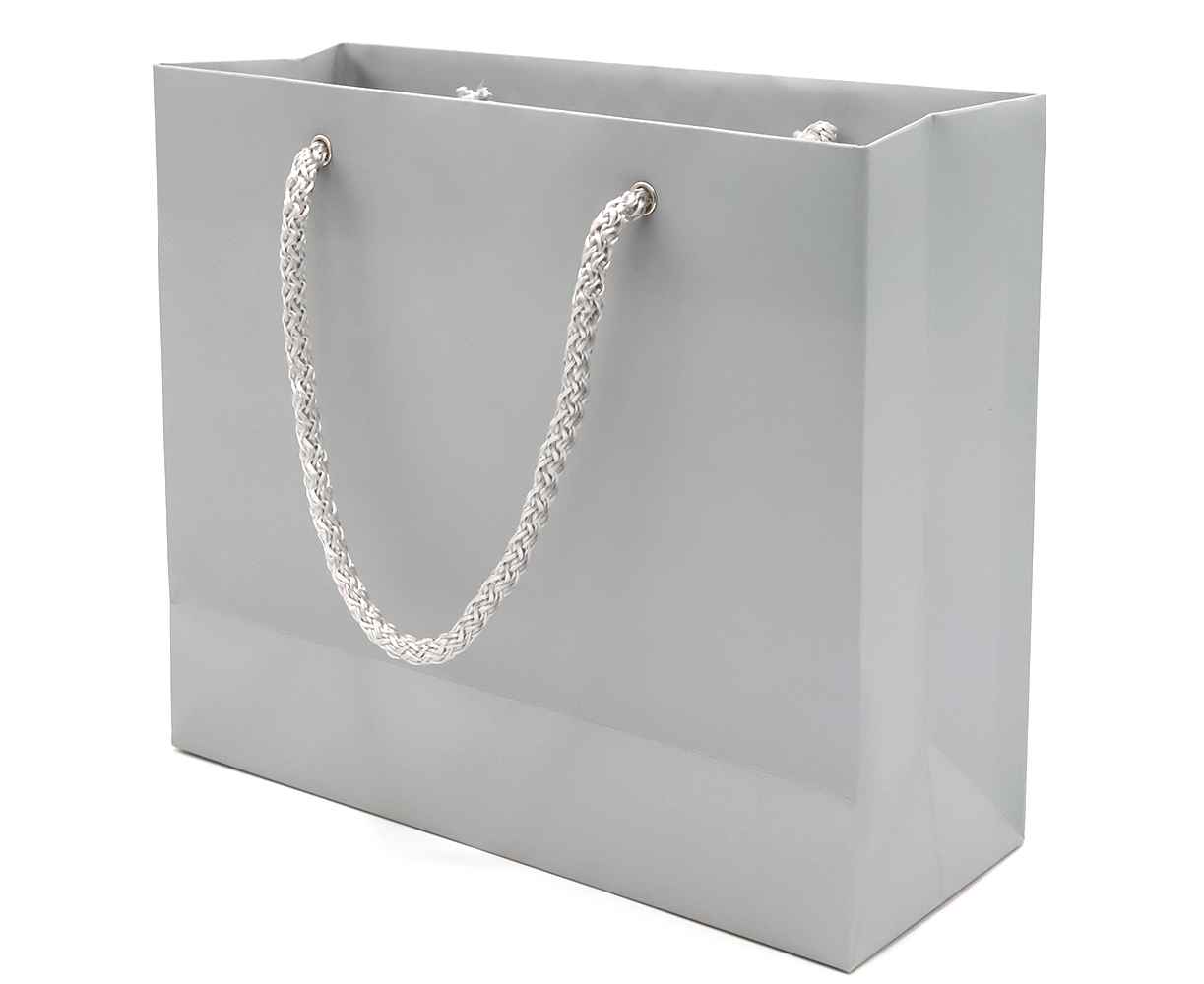 Бумажный цветной пакет плотностью 170 г/м². Покрытие софт-тач. Шнур 6 мм серого цвета. Люверс - серебристый.