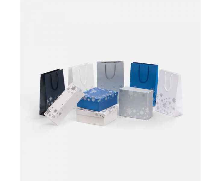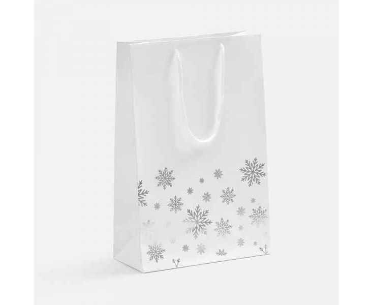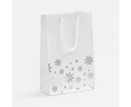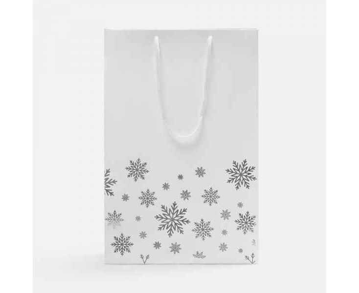 Пакет из бумаги плотностью 120 г/м²с покрытием софт-тач и тиснением серебристой фольгой.Выдерживает вес до 2 кг.
