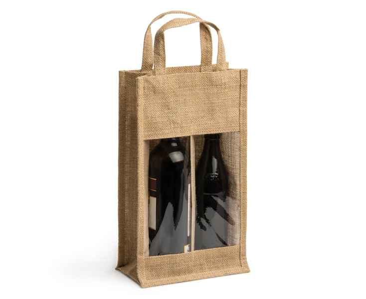 Ламинированная сумка для вина из джута с окном и двойным отделением. Идеально подходит для бутылок. Усиленные ручки.