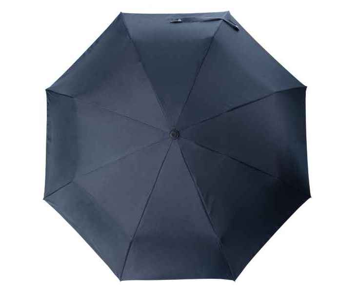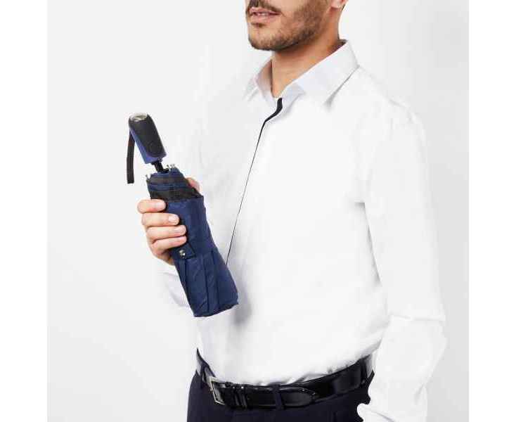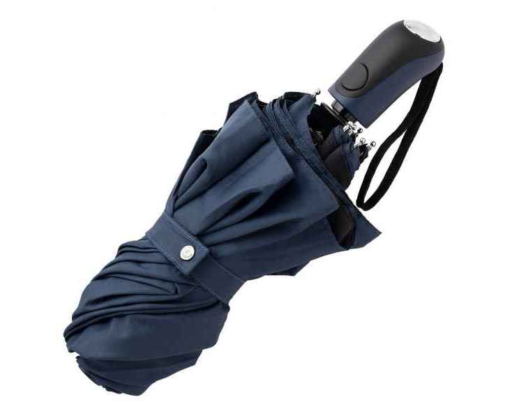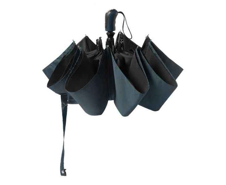 Зонт карманный 'Irving' играет на контрасте черного и темно-синего. Его двойной купол синий снаружи и черный внутри, а его прорезиненная ручка очень удобно лежит в руке.