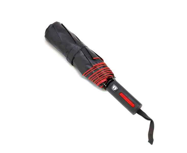 Автоматический противоштормовой складной зонт Sherp. Материал купола – эпонж. На таком материале вода превращается в капельки и скатывается, а сам зонт остается сухим. Цветной элемент на ручке – в тон купола. Ветрозащитная функция – спицы из стекловолокна, а специальное устройство препятствует поломке спиц при резких порывах ветра.