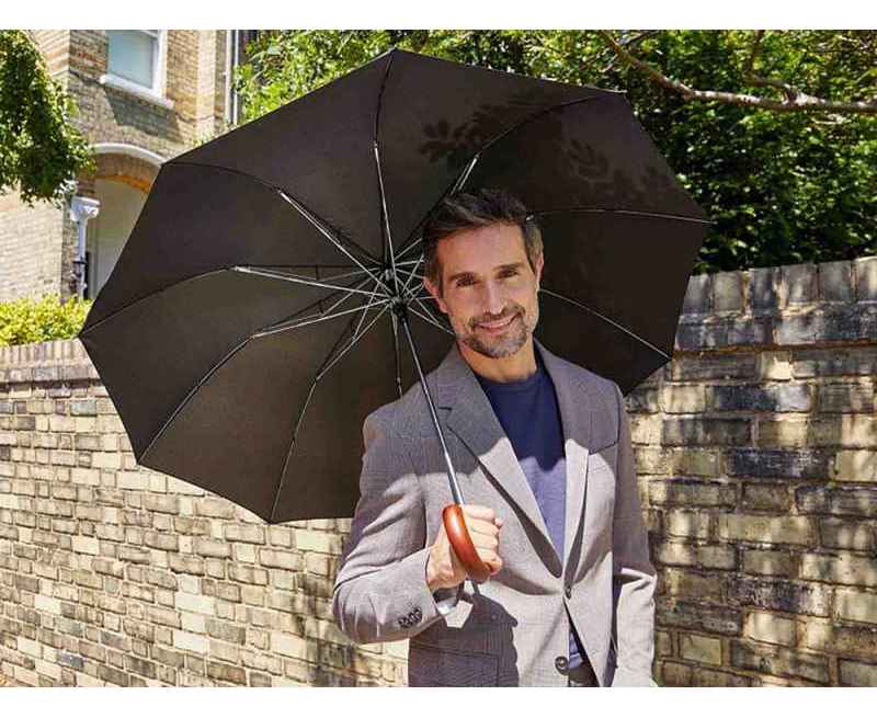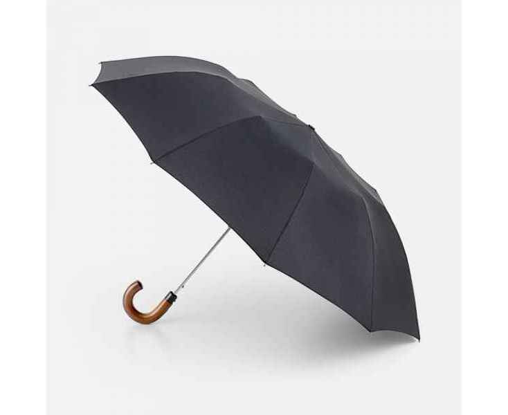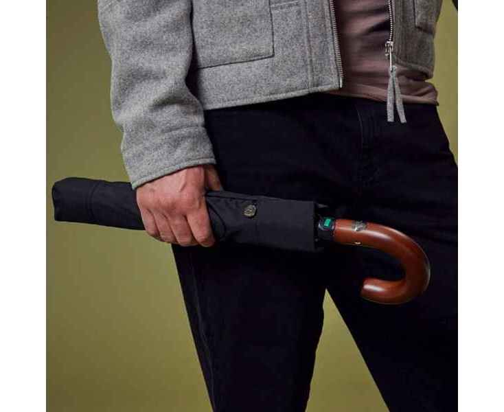 Идеальная модель для тех, кто не задается целью найти легкий и короткий складной зонт-«механику», а скорее, обрадуется старому доброму увесистому и основательному полуавтомату. У модели ветроустойчивая конструкция. Рукоять выполнена из массива дерева и благодаря натуральности материала невероятно комфортно ощущается в руке.