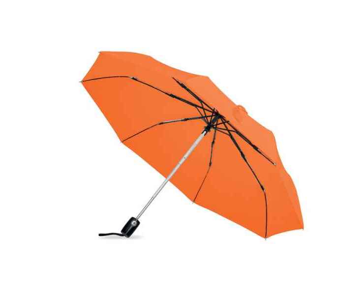 21 Inch Luxe 3 fold automatic windproof umbrella in 190T pongee with zinc plated steel shaft, black ribs with 2 sections fiberglass and chrome metal tips , black rubberised handle with doming. Includes matching pouch. Auto closure.