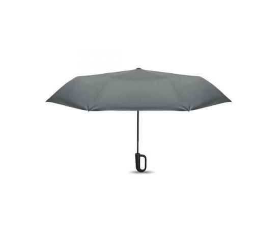 'Складной ветроустойчивый зонт 21'' из эпонжа RPET 190T с каркасом и спицами из стекловолокна. D-образная ручка-карабин с резиновым покрытием. Автоматическое открывание и закрывание. В комплект входит чехол.'