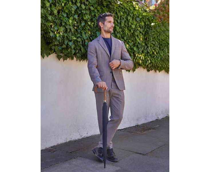 Большой фактурный купол сделан из люксового поликоттона, который очень красиво и необычно смотрится на свету. Деревянная рукоятка с металлическим кольцом, под которое заправляются спицы, добавляет аксессуару престижа и изящества.